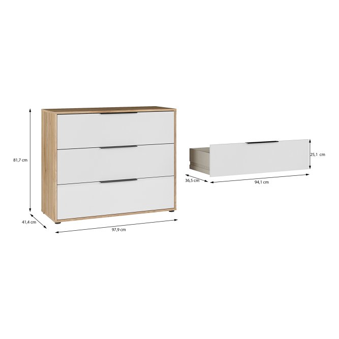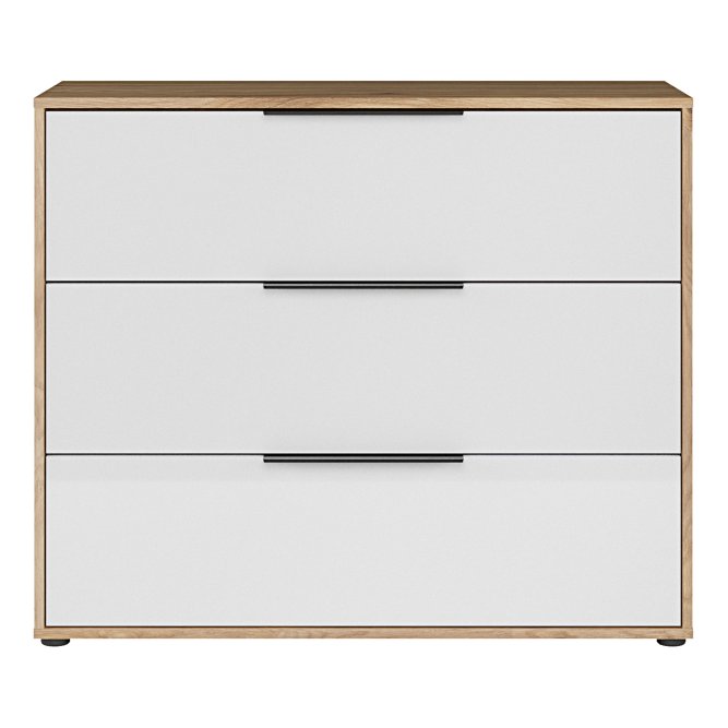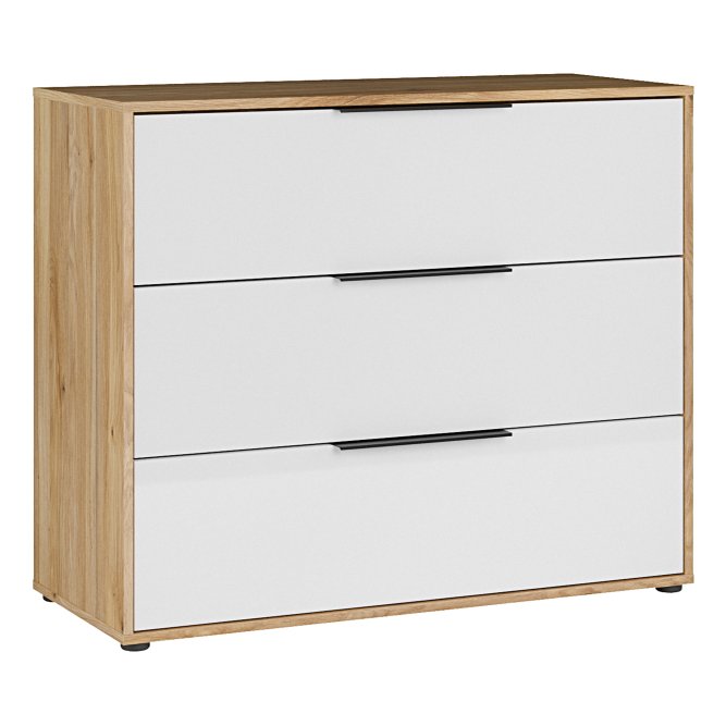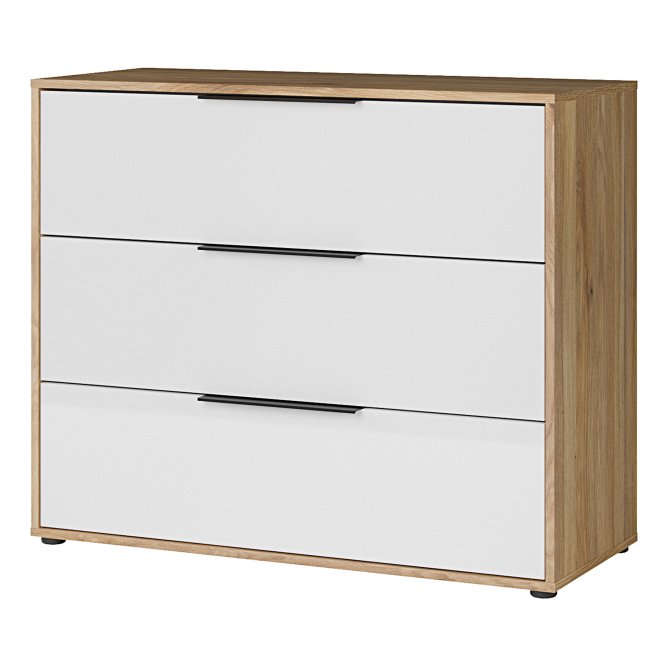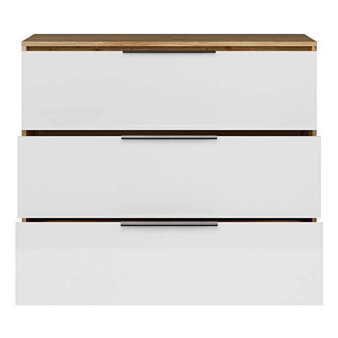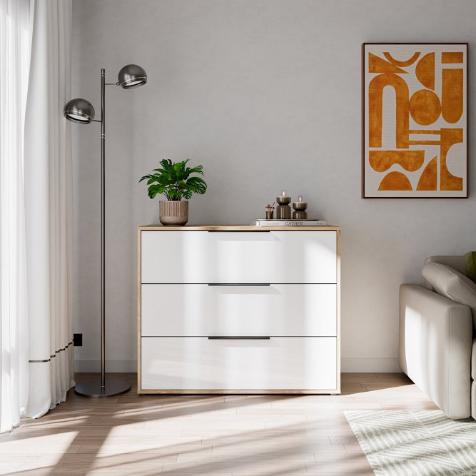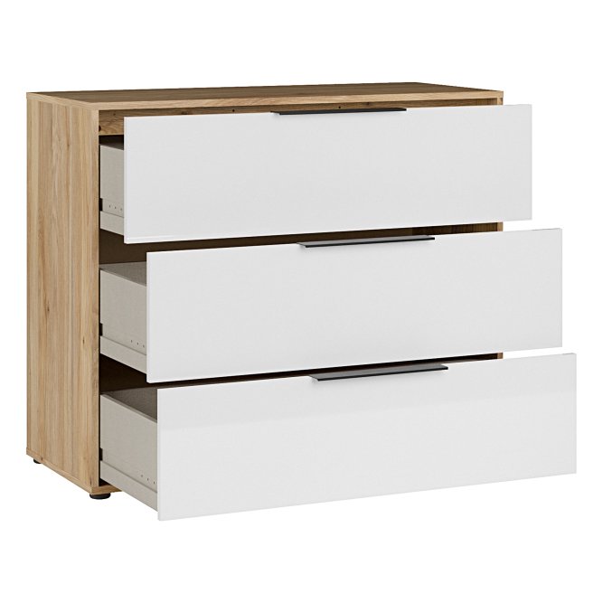 - Komoda w efektowym połączeniu dekorów Dąb Mauvella i Biały Połysk