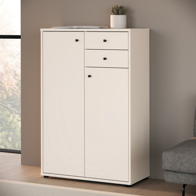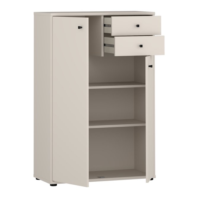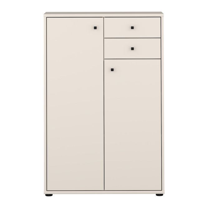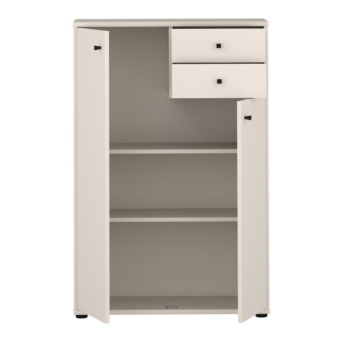 Dwudrzwiowa komoda z szufladami o prostej i ponadczasowej budowie podkreśli unikatowy charakter wnętrza, a jednocześnie zapewni odpowiednią przestrzeń do przechowywania. Mebel wyposażony jest w dwie pojemne szuflady oraz trzy pojemne półki, które znajdują się w jej wnętrzu, dzięki czemu umożliwia optymalną segregację bielizny, galanterii, mniejszych akcesoriów, a także przechowywanie większych przedmiotów. Duży blat komody sprawdzi się świetnie jako dodatkowa przestrzeń do umieszczenia fotografii, dekoracyjnych bibelotów lub roślin doniczkowych. Komoda idealnie sprawdzi się zarówno w salonie i sypialni, jak i w biurze czy też przedpokoju. Zestawiając ją z innymi meblami z kolekcji stworzysz spójną aranżację swojego wnętrza.