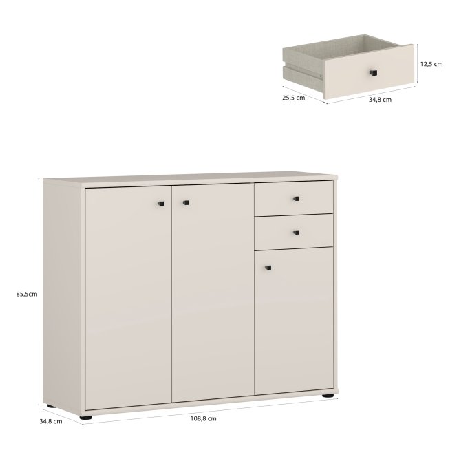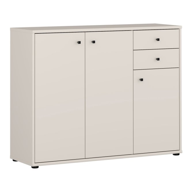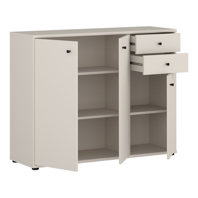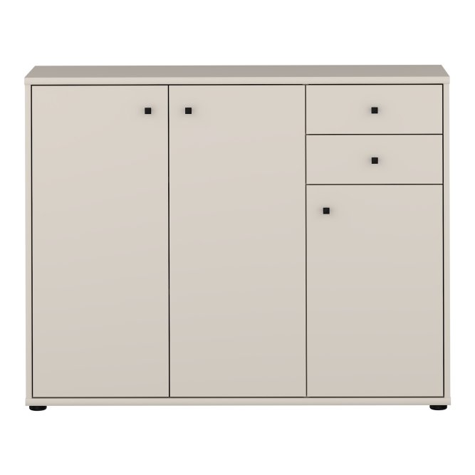 Trzydrzwiowa komoda z szufladami w stylowym piaskowym kolorze podkreśli unikatowy charakter wnętrza, zapewniając jednocześnie odpowiednią przestrzeń do przechowywania. Dwie zamykane szafki z sześcioma półkami wewnątrz umożliwiają optymalną segregację bielizny, galanterii oraz mniejszych i większych przedmiotów. Dodatkowo, komoda wyposażona jest w dwie szuflady, które będą idealnym miejscem na drobiazgi i mniejsze akcesoria. Szeroki blat będzie doskonałym miejscem na wyeksponowanie zdjęć, ozdobnych świeczników, ceramiki, pamiątek z wakacji oraz innych ulubionych dekoracji. Wyjątkowa kolorystyka i prosty styl mebla wprowadzi do wnętrza naturalność, przytulność i poczucie domowego ciepła. Komoda idealnie sprawdzi się zarówno w salonie i sypialni, jak i w biurze czy też przedpokoju. Zestawiając ją z innymi meblami z kolekcji stworzysz spójną aranżację swojego wnętrza.