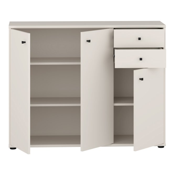 Komoda wyposażona w dwie szuflady o maksymalnym obciążeniu do 5 kg, a także w dwie zamykane szafki, w których znajduje się sześć półek o maksymalnym obciążeniu 15 kg