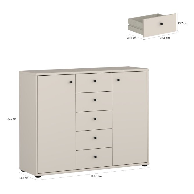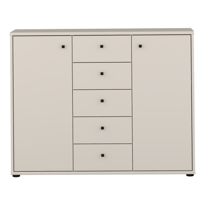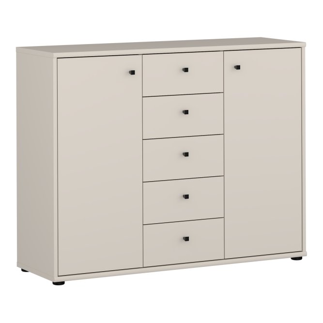 Szeroka komoda z szufladami w stylowym piaskowym kolorze podkreśli unikatowy charakter wnętrza, zapewniając jednocześnie odpowiednią przestrzeń do przechowywania. Pięć szuflad oraz dwie zamykane szafki z półkami wewnątrz umożliwiają optymalną segregację bielizny, galanterii, mniejszych i większych przedmiotów. Duży blat sprawdzi się świetnie jako dodatkowa przestrzeń do umieszczenia fotografii, dekoracyjnych bibelotów lub roślin doniczkowych. Komoda świetnie sprawdzi się w takich pomieszczeniach jak sypialnia, przedpokój, domowe biuro czy salon. Wyjątkowa kolorystyka i prosty styl mebla wprowadzi do wnętrza naturalność, przytulność i poczucie domowego ciepła. Aby stworzyć spójną aranżację, zestaw komodę o szerokości niemal 110 cm z innymi meblami z tej samej kolekcji.
