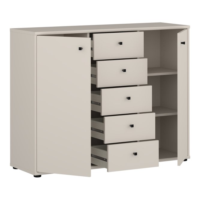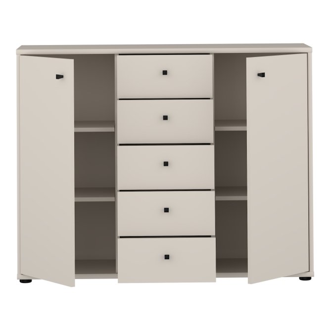 Komoda wyposażona w pięć szuflad o maksymalnym obciążeniu do 5 kg, a także w dwie zamykane szafki, w których znajduje się sześć półek o maksymalnym obciążeniu 15 kg