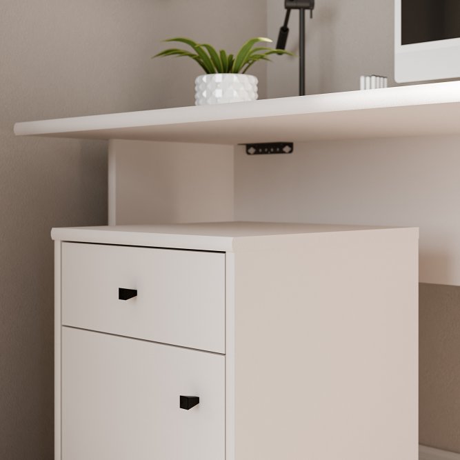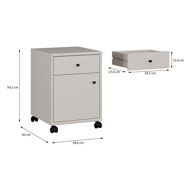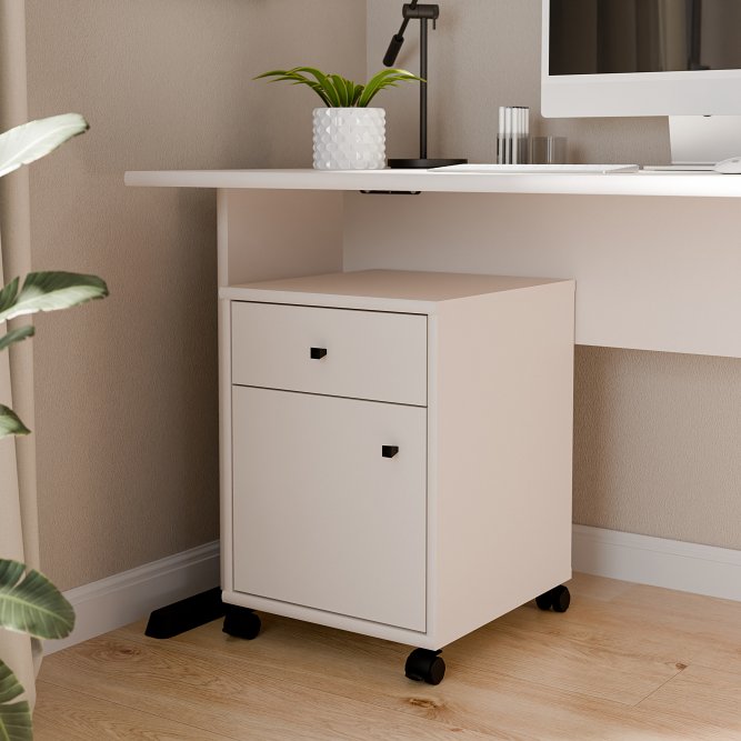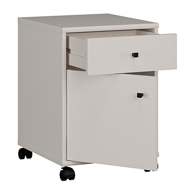 Praktyczny i kompaktowy kontener na kółkach to niezawodny sposób na uzupełnienie biura, gabinetu, a nawet pokoju nastolatka. Dzięki mobilnym kółkom możesz w razie potrzeby przesuwać go w dowolne miejsce - możesz wsunąć go pod biurko, ustawić obok komody lub potraktować jako mobilny stolik kawowy. Mebel wyposażony jest w szafkę i podręczną szufladę, które zapewniają odpowiednie miejsce do przechowywania dokumentów, przyborów biurowych lub szkolnych oraz wielu innych drobiazgów. Połącz kontener na kółkach z innymi meblami z naszej kolekcji i stwórz przytulne, funkcjonalne wnętrze.