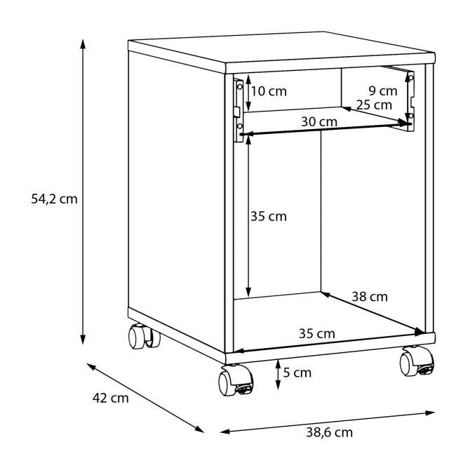 Kontener na kółkach o wymiarach: 38,6 cm szerokości, 54,2 cm wysokości oraz 42 cm głębokości