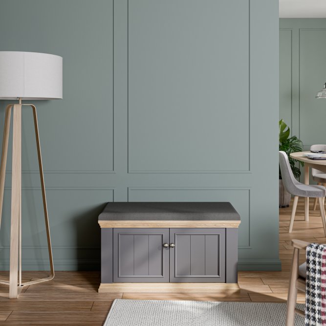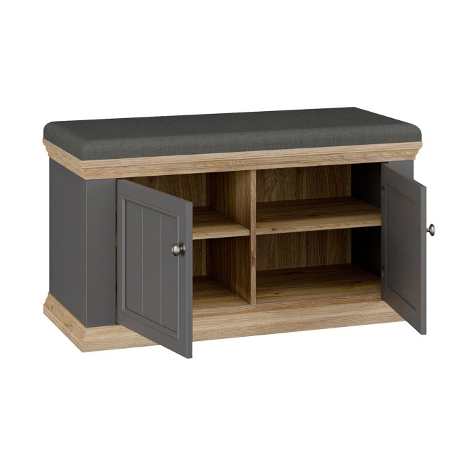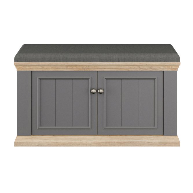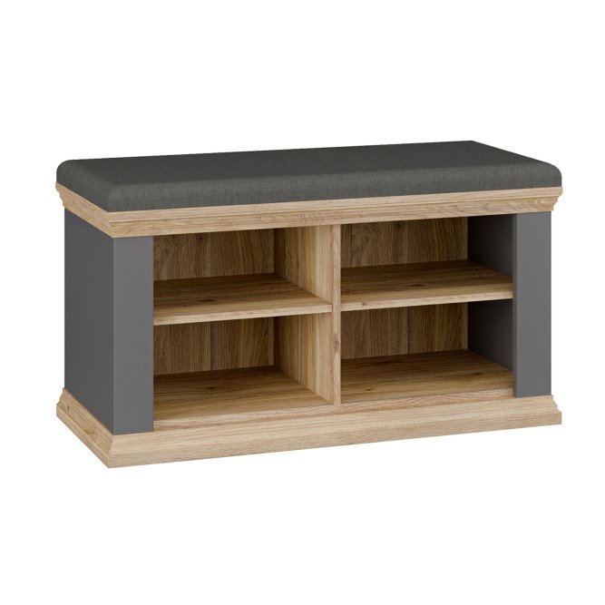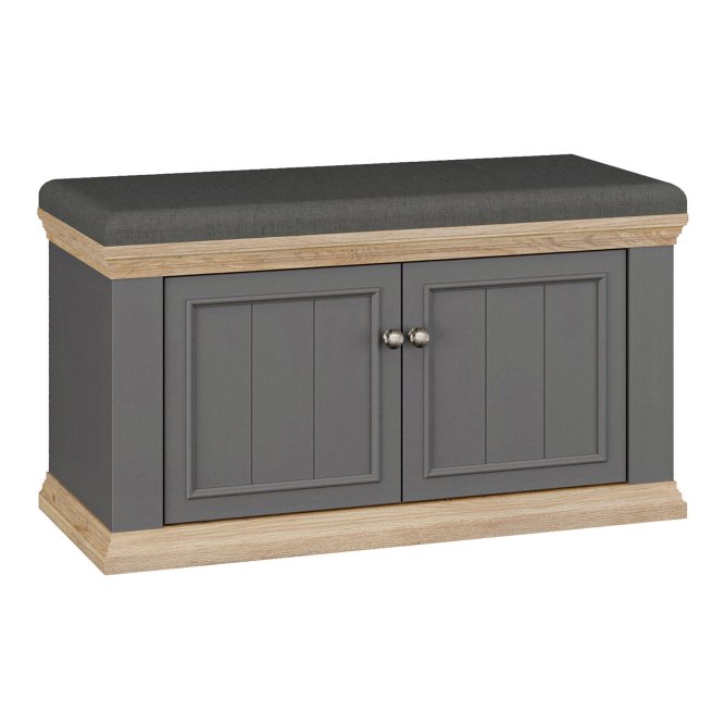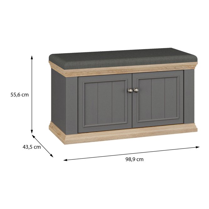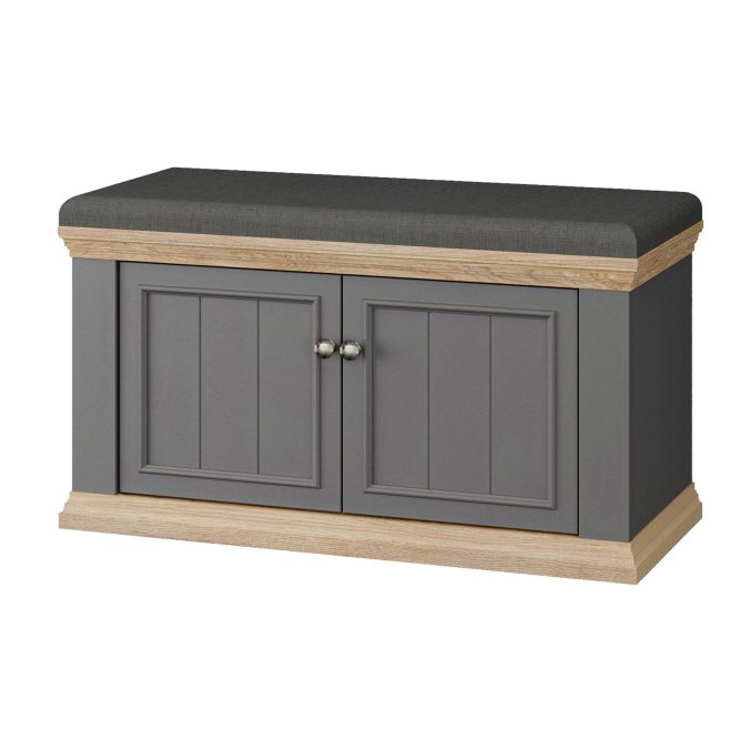 Elegancka i funkcjonalna ławeczka tapicerowana PONTYPOOL do przedpokoju lub garderoby, łącząca wygodne, miękkie siedzisko z zamykanym schowkiem na obuwie i akcesoria. Ławeczka zapewnia wygodne miejsce do siedzenia oraz estetyczne, zamknięte miejsce do przechowywania butów lub innych przedmiotów. Dwukolorowe wykończenie (korpus w dekorze Dąb Mauvella + listwy w dekorze Uni Wolfram Szary) nadaje meblowi klasyczny, stylowy charakter.