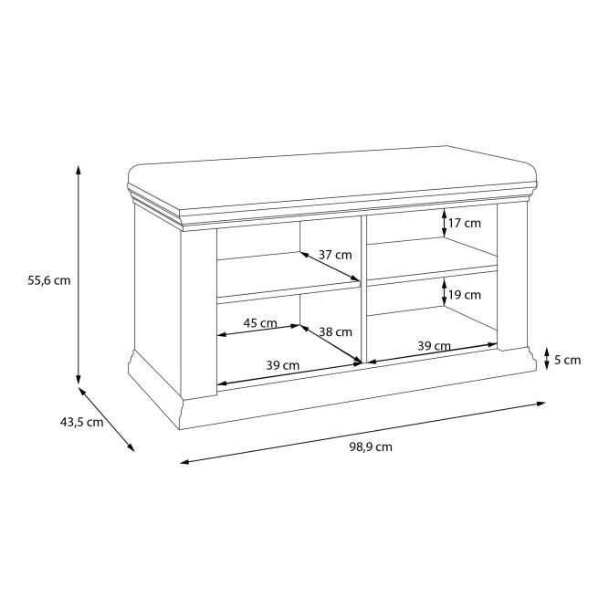 Wymiary ławeczki: szer. 98,9 cm, wys. 55,6 cm, gł. 43,5 cm