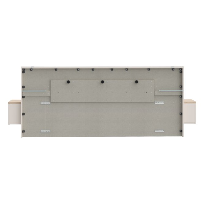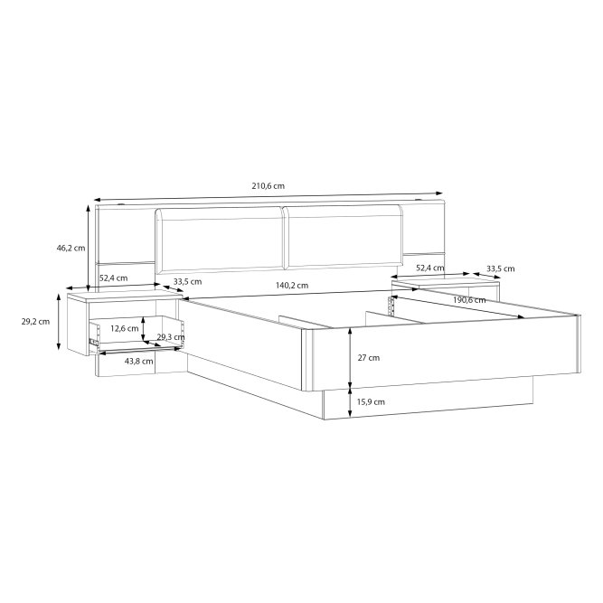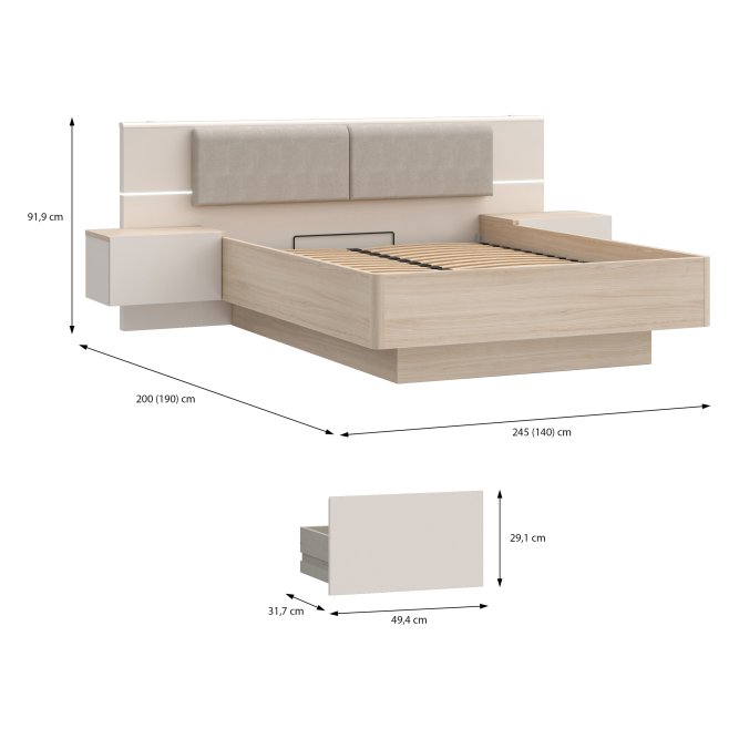 - Stelaż łóżka o wymiarach 246,4 cm szerokości, 91,7 cm wysokości wezgłowia oraz 200 cm głębokości