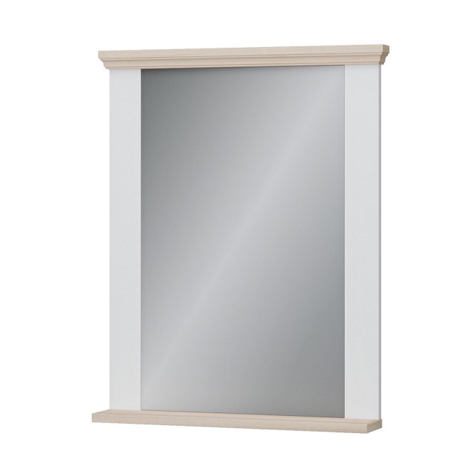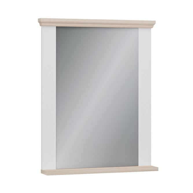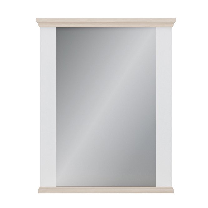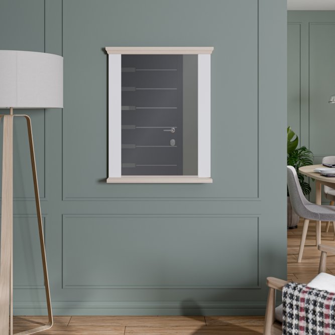 Eleganckie lustro PONTYPOOL w klasycznej oprawie łączącej biały kolor z dekoracyjnym wieńcem w dekorze Dąb Riva. Subtelne zdobienie górnej i dolnej listwy nadaje mu lekko tradycyjny charakter, jednocześnie pasując do nowoczesnych wnętrz dzięki prostej formie tafli. Idealne do zastosowania w przedpokoju, łazience (jeśli warunki wilgotnościowe na to pozwalają) lub nad konsolą — estetyczne uzupełnienie wnętrza łączące ciepło drewna z neutralną bielą.