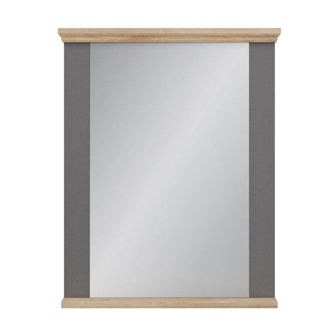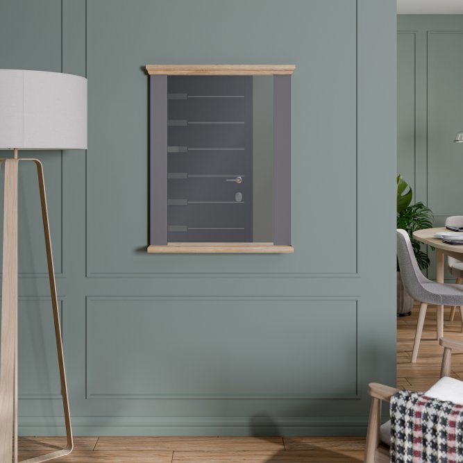 Eleganckie lustro PONTYPOOL w klasycznej oprawie łączącej szary kolor z dekoracyjnym wieńcem w dekorze Dąb Mauvella. Subtelne zdobienie górnej i dolnej listwy nadaje mu lekko tradycyjny charakter, jednocześnie pasując do nowoczesnych wnętrz dzięki prostej formie tafli. Idealne do zastosowania w przedpokoju, łazience (jeśli warunki wilgotnościowe na to pozwalają) lub nad konsolą — estetyczne uzupełnienie wnętrza łączące ciepło drewna z neutralną szarością.