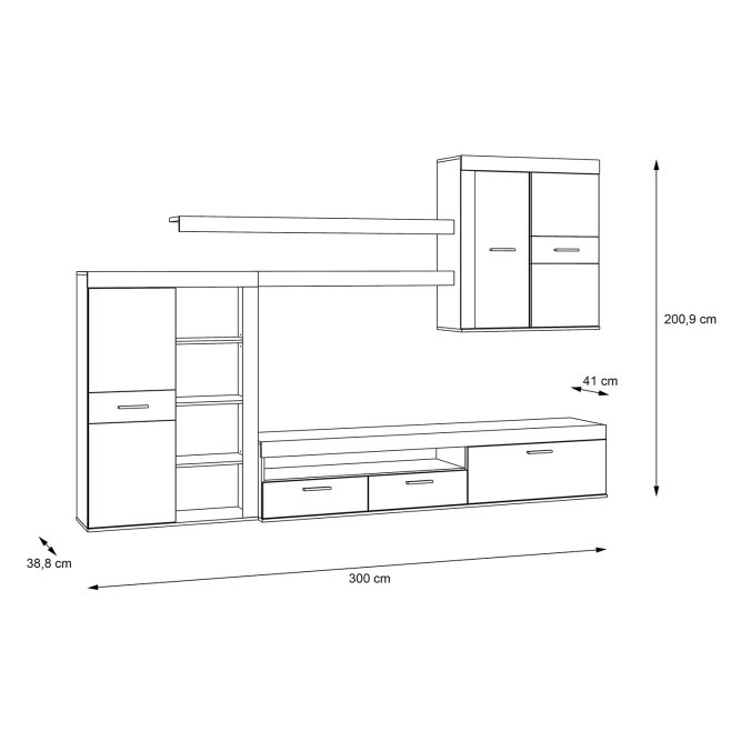 Dzięki dużej ilości miejsca do przechowywania i ustawiania, ta meblościanka zapewnia praktyczność i styl, a także idealnie zestawioną kolorystykę i stylowy wygląd. Podświetlone szklane półki nadają temu zestawowi nowoczesny akcent. Meblościanka składa się z dwóch witryn, szafki RTV i półki ściennej.