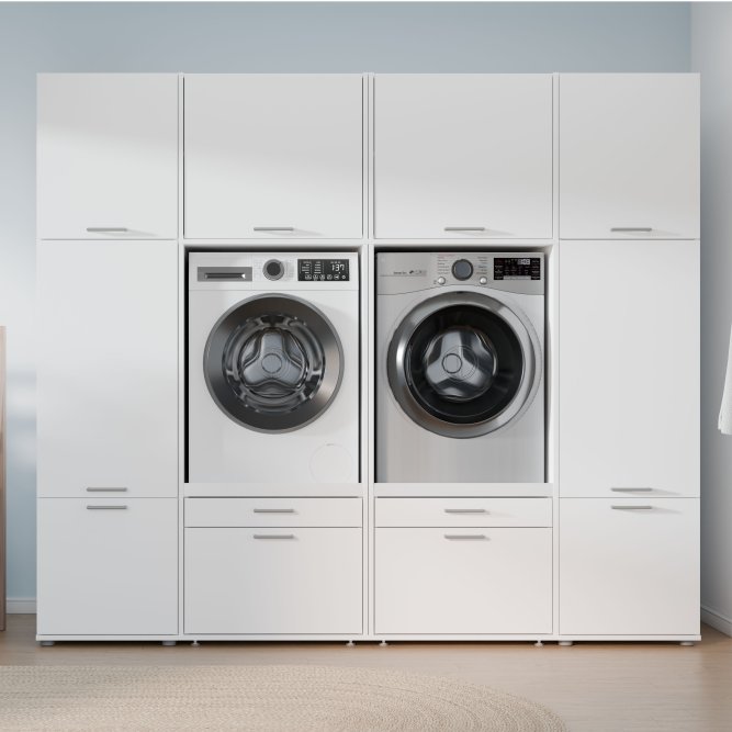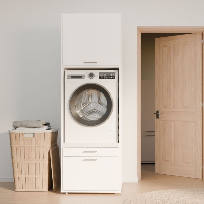 Nadstawka WASHCAB o szerokości 67 cm to kompaktowe i eleganckie uzupełnienie zabudowy strefy prania. Zamykana szafka została zaprojektowana tak, aby maksymalnie wykorzystać przestrzeń pionową. Wnętrze wyposażone w dwie praktyczne półki (wys. 26 cm i 28 cm) daje dodatkowe miejsce na detergenty, akcesoria i drobne przedmioty. Podłużny metalowy uchwyt ułatwia wygodny dostęp do zawartości, a system cichego domyku zapewnia komfort użytkowania. Nadstawka pasuje do szafek WASHCAB o szerokości 67 cm, umożliwiając spójną i estetyczną aranżację.