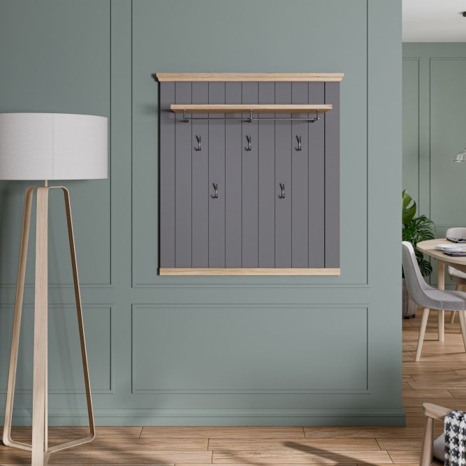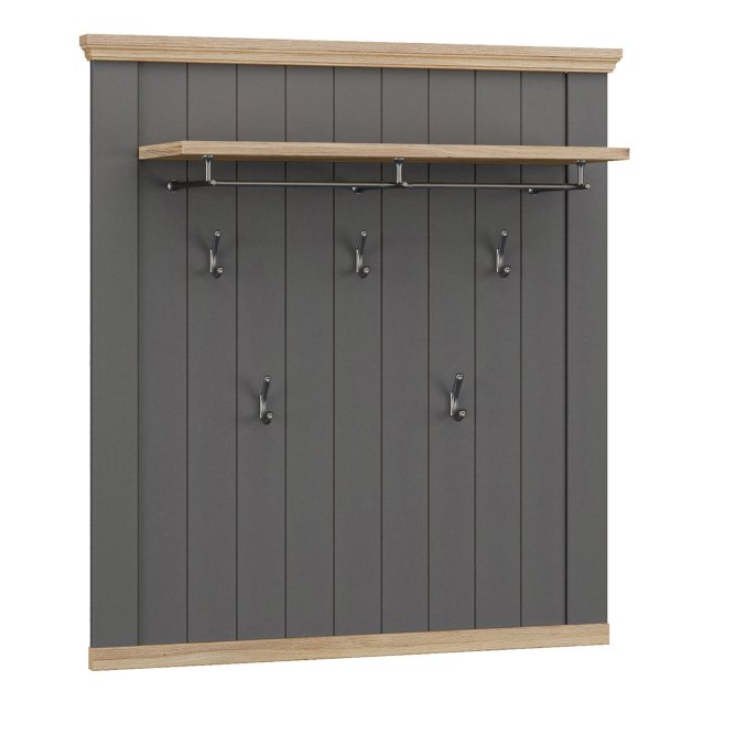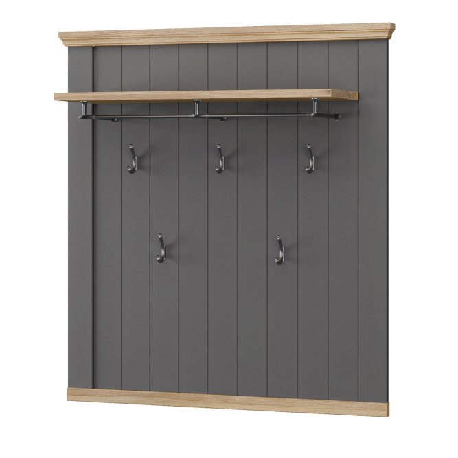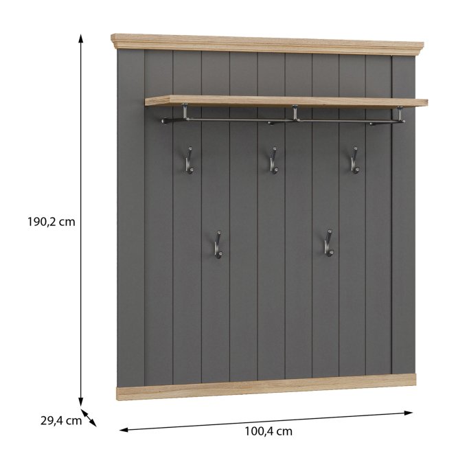 Panel wiszący PONTYPOOL to funkcjonalny wieszak garderobiany w stylu nowoczesnym, łączący szary front z dekoracyjnymi listwami w dekorze Dąb Mauvella. Wyposażony w półkę z drążkiem oraz pięć metalowych haczyków, daje wygodne miejsce do odwieszania kurtek i przechowywania czapek czy torebek. Dzięki szerokim wymiarom (100,4 × 109,2 × 29,4 cm) panel sprawdzi się jako praktyczne i dekoracyjne rozwiązanie w przedpokoju lub przy wejściu.