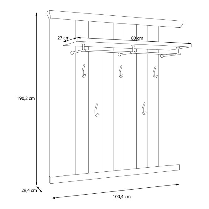 Panel wyposażony w półkę z drążkiem o długości 68 cm, 5 metalowych haczyków