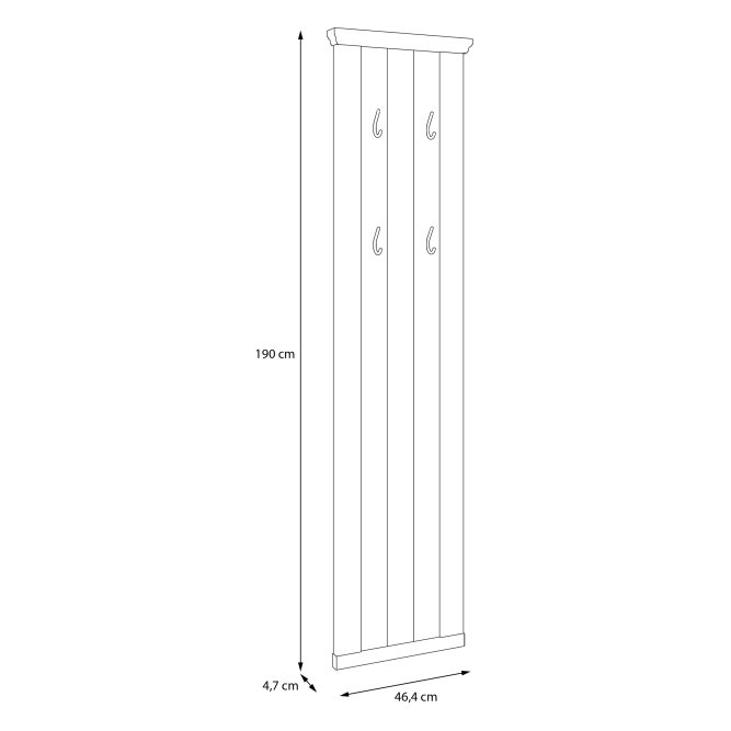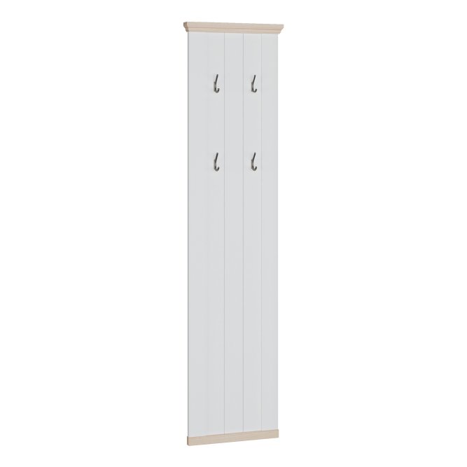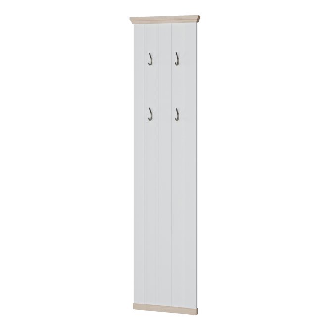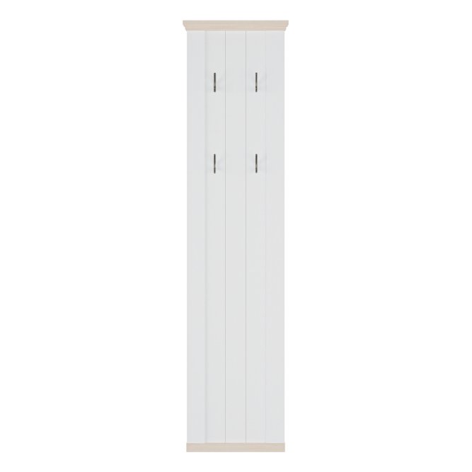 Panel wiszący PONTYPOOL łączy jasny, biały front z dekoracyjnymi listwami w kolorze Dąb Riva, tworząc subtelny, skandynawski akcent w przedpokoju lub innym pomieszczeniu. Wysoka i wąska forma (46,4 × 190 × 4,7 cm) optycznie wydłuża przestrzeń i nie zabiera miejsca użytkowego. Panel wyposażono w cztery metalowe haczyki do zawieszania odzieży i akcesoriów.