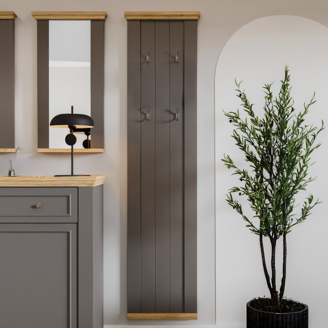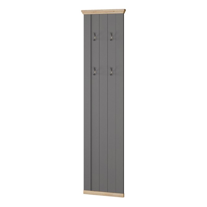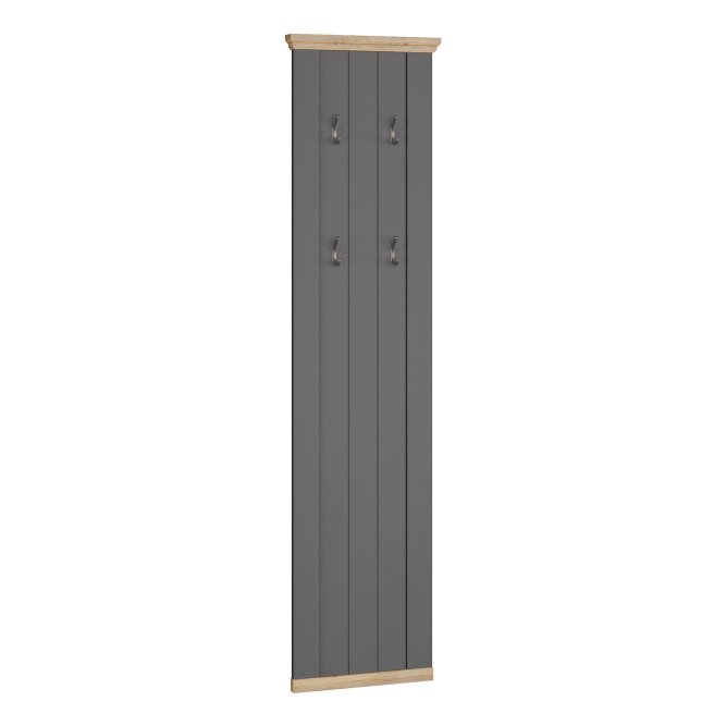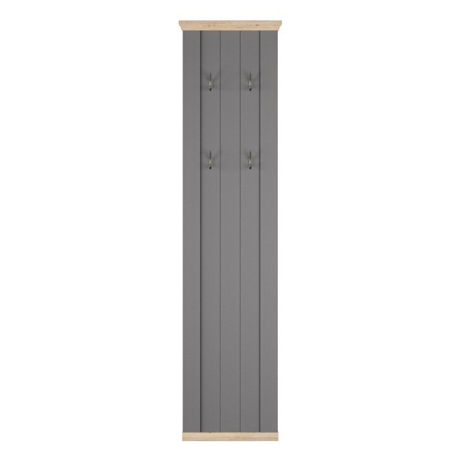 Panel wiszący PONTYPOOL łączy stonowany szary front z dekoracyjnymi listwami w kolorze Dąb Mauvella, tworząc elegancki i klasyczny akcent w przedpokoju lub w innym pomieszczeniu. Wysoka i wąska forma (46,4 × 190 × 4,7 cm) optycznie wydłuża przestrzeń i nie zabiera miejsca użytkowego. Panel wyposażono w cztery metalowe haczyki do zawieszania odzieży i akcesoriów.