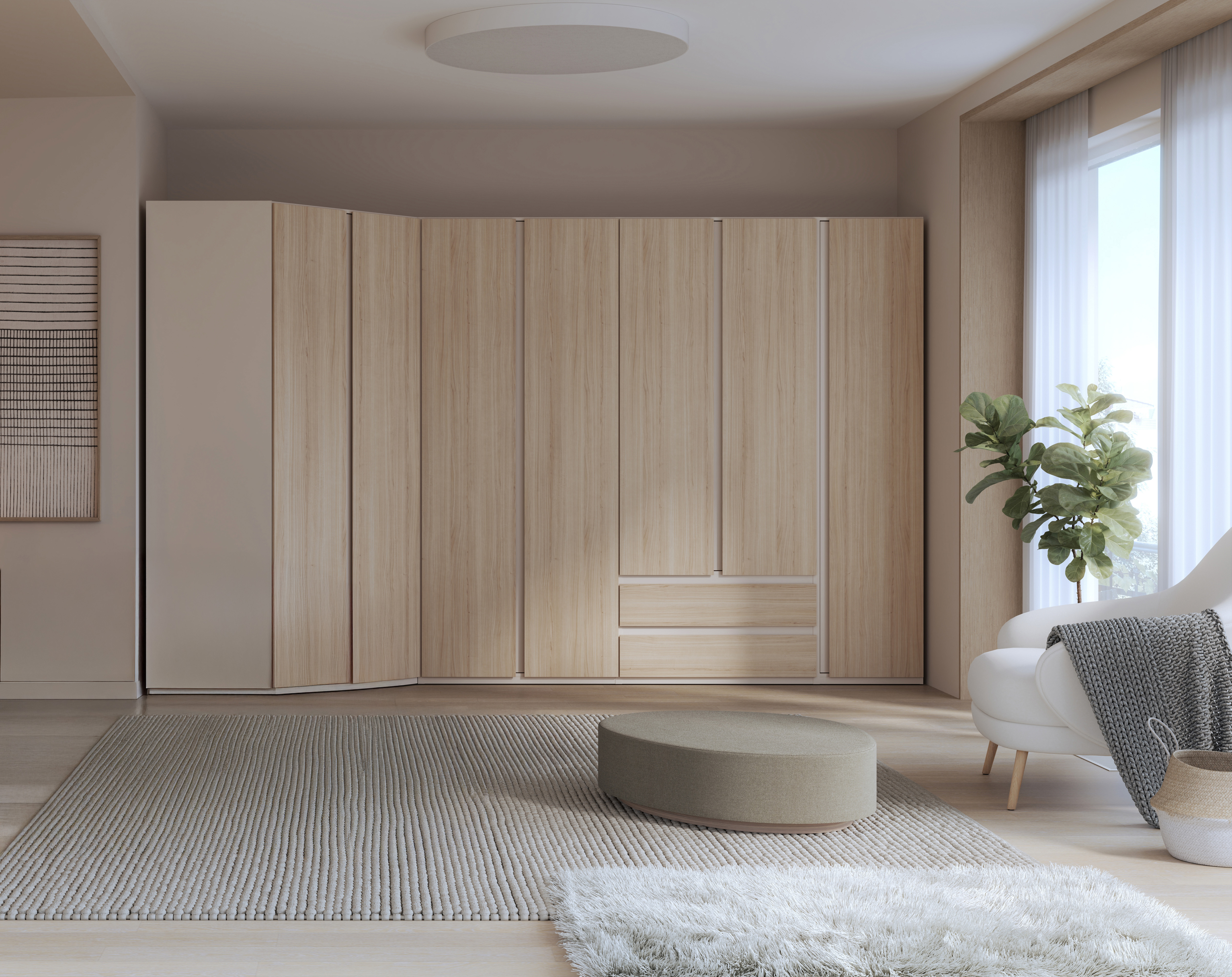 Kolekcja PANOPTIK została zaprojektowana tak, aby dopełniac spokojne, wyciszające aranżacje sypialni. Znajdziesz w niej kilka modeli łóżek z szafkami nocnymi zintegrowanymi z korpusem oraz szafy uchylne w różnych rozmiarach. To wszystko, czego potrzebujesz do stworzenia komfortowej przestrzeni. A estetyka? Zwróc uwagę na detale i połączenie kolorystyczne dekoru Dąb Riva i Piaskowego.