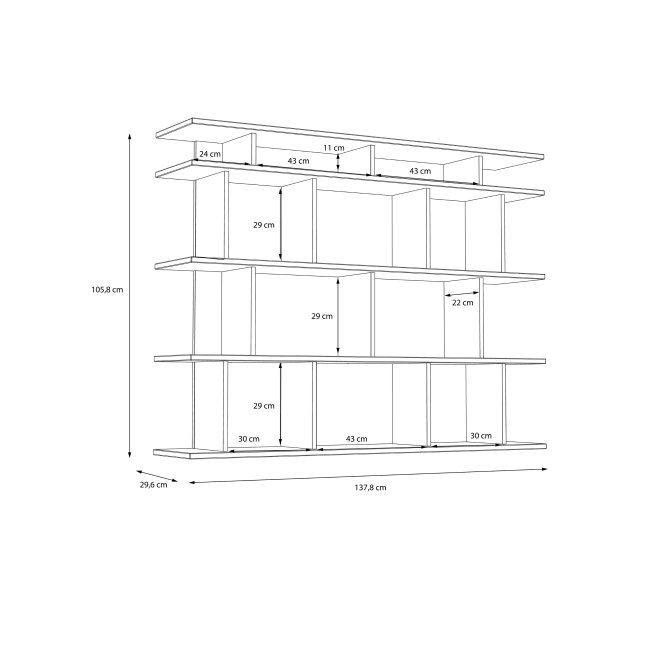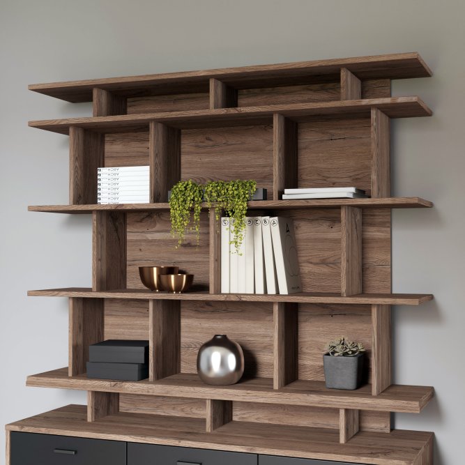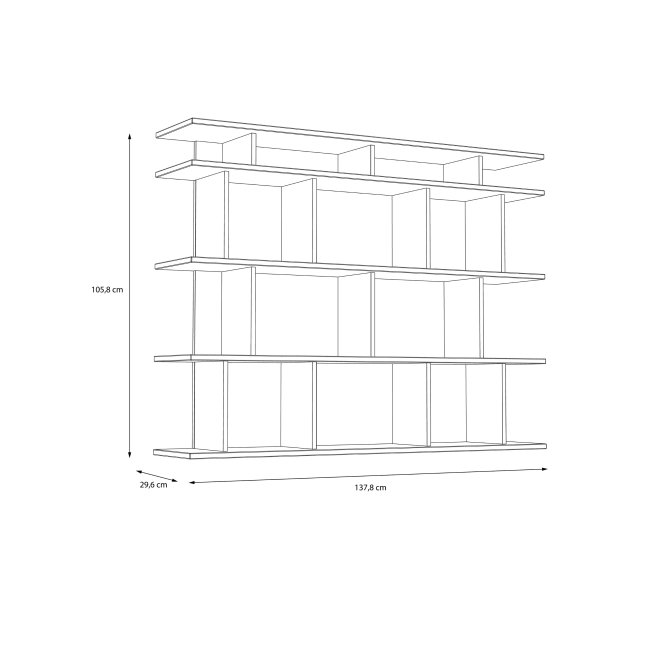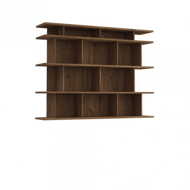 Duży regał NEYLE to odpowiedź na potrzebę zagospodarowania wielu książek, dekoracji, sklejanych modeli czy kolekcji, np. analogowych aparatów fotograficznych. Niesymetryczny podział półek rozkłada ich ciężar, dzięki czemu zabudowany regał jest solidny i wytrzyma kilkukilogramowe obciążenie. Idealnym miejscem na regał wiszący NEYLE jest przestronna ściana nad komodą, szafką RTV z kolekcji lub narożnikiem.