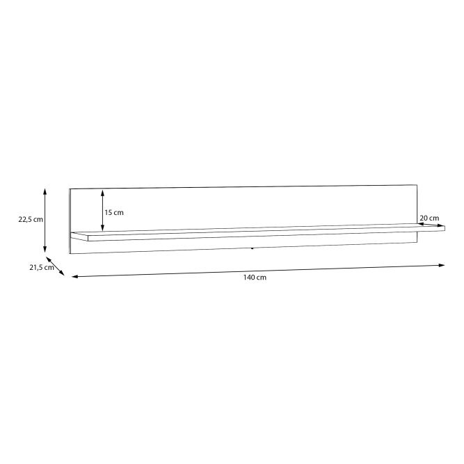 Półka wisząca o wymiarach: 140 cm szerokości, 22,5 cm wysokości i 21,5 cm głębokości