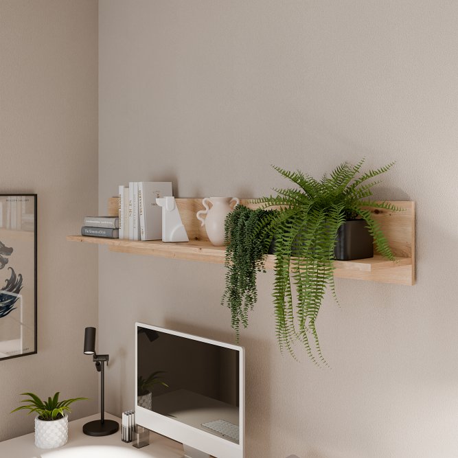 Półka wisząca to stylowy akcent i idealny sposób na prezentację dekoracji, książek i pamiątek. Mebel zapewni Ci jeszcze więcej miejsca do przechowywania i ekspozycji, a dzięki wykorzystaniu pionowej powierzchni ściany - nie przytłoczy Twojego wnętrza. Półka wyposażona jest w tylny panel, który zapobiega zabrudzeniom ściany i stanowi atrakcyjne tło dla eksponowanych dekoracji. Dzięki naturalnej kolorystyce będzie pasować do wielu wnętrz urządzonych w różnych stylach. Aby stworzyć spójne wizualnie wnętrze możesz połączyć półkę wiszącą z pozostałymi meblami z kolekcji.