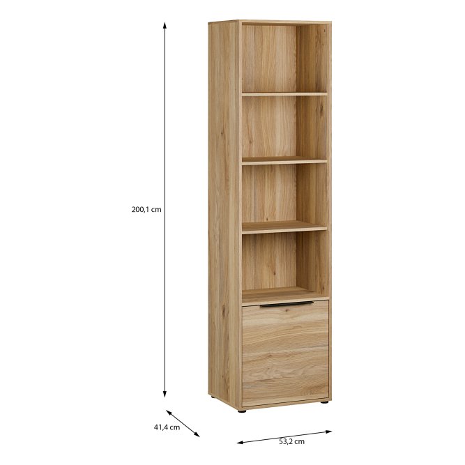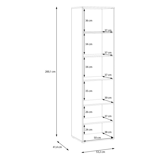 Regał o wymiarach 53,2 cm szerokości, 200,1 cm wysokości i 41,4 cm głębokości