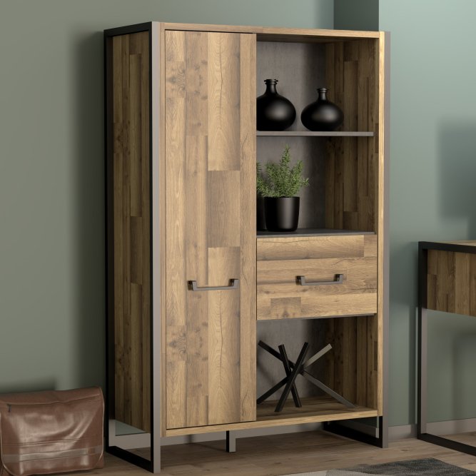 Elegancki regał w nowoczesnym stylu doskonale wpisze się we wnętrze salonu, domowego gabinetu czy też pokoju młodzieżowego. Wykonany w dekorze Dąb Klepkowy ze wstawkami w dekorze Beton Ciemnoszary wyróżnia się oryginalnym designem.