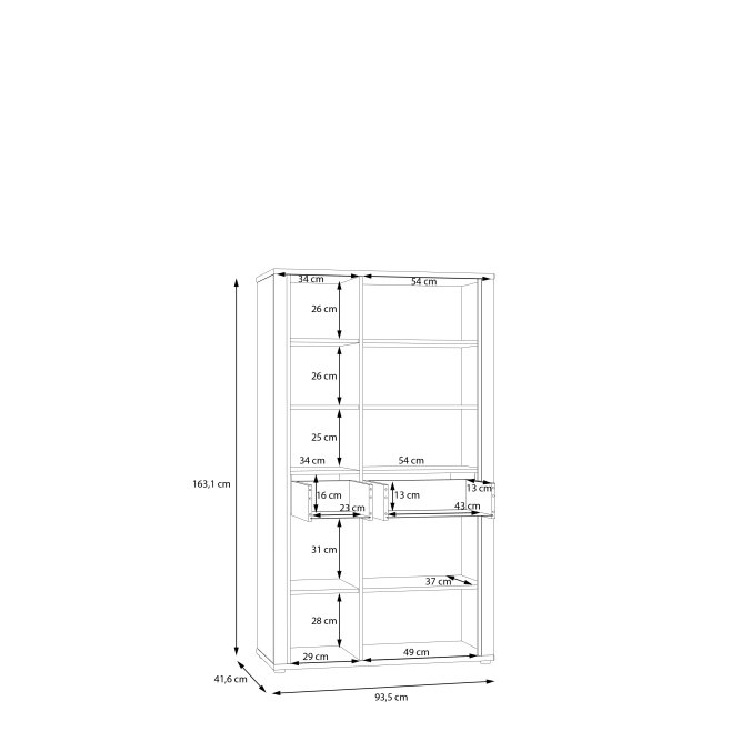 - Wymiary: szerokość 93,5 cm, wysokość 163,1 cm i głębokość 41,6 cm