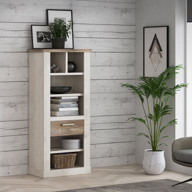 Elegancki, wąski regał dzięki doskonałemu połączeniu dekoru Pinia Biała i Dąb Antyczny idealnie wkomponuje się w przestrzeń gabinetu, salonu lub sypialni. Regał posiada sześć półek i jedną szufladę, dzięki czemu stwarza więcej miejsca do przechowywania.
