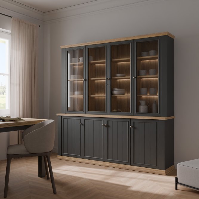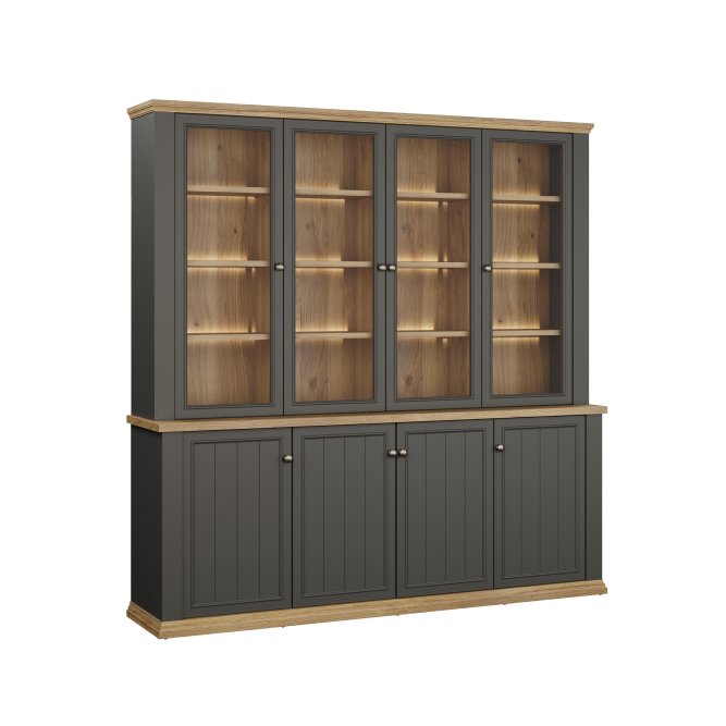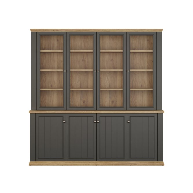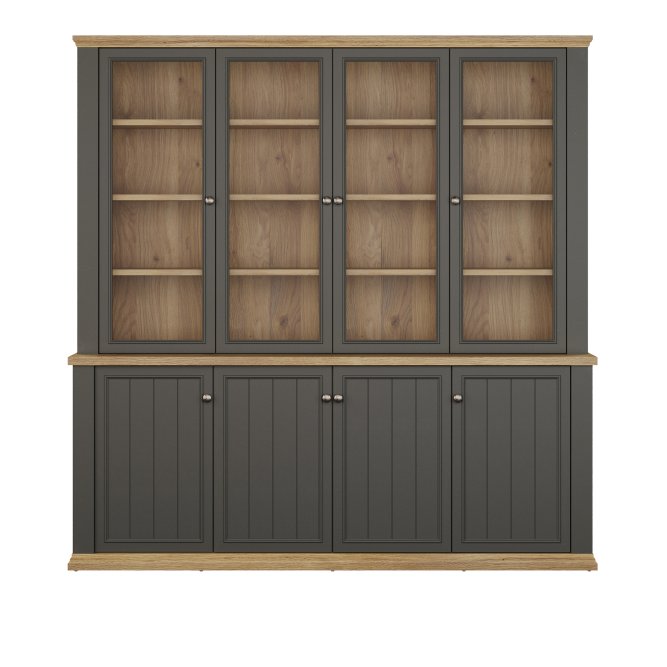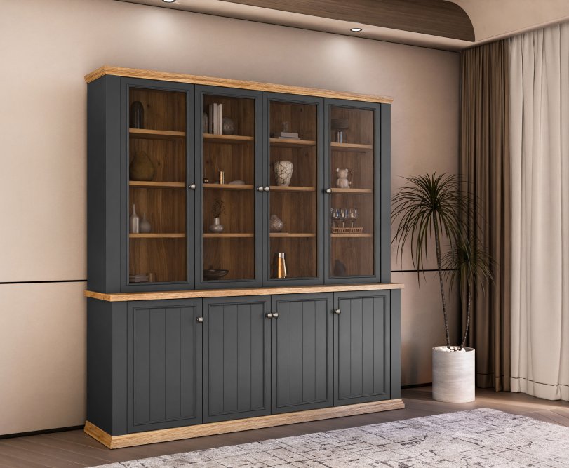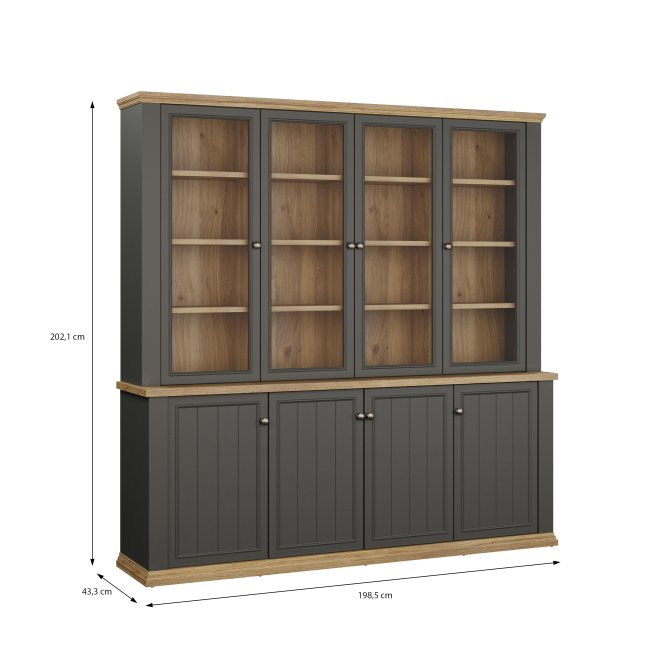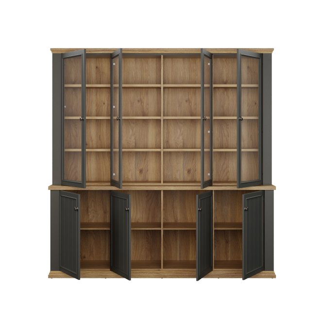 8-drzwiowy regał z kolekcji PONTYPOOL o szerokości niemal 200 cm świetnie wyeksponuje Twoje ulubione książki, pamiątki oraz dekoracje. Mebel wyposażony jest w aż 16 półek, co gwarantuje mnóstwo miejsca do przechowywania, a transparentne, bezpieczne szkło hartowane zastosowane w 4 drzwiach regału umożliwi wyeksponowanie wybranych przedmiotów. 8-drzwiowy regał PONTYPOOL doskonale wygląda zestawiona z pozostałymi elementami z kolekcji, tworząc wymarzoną aranżację salonu.