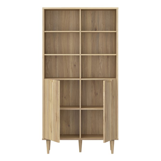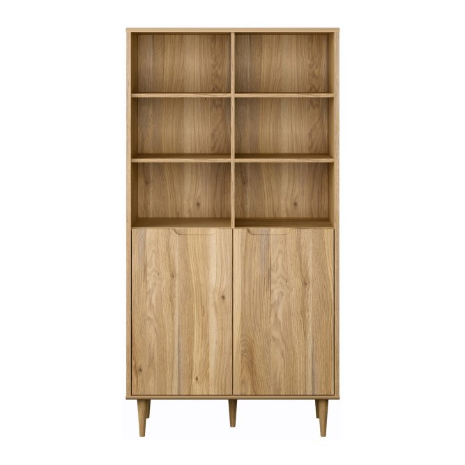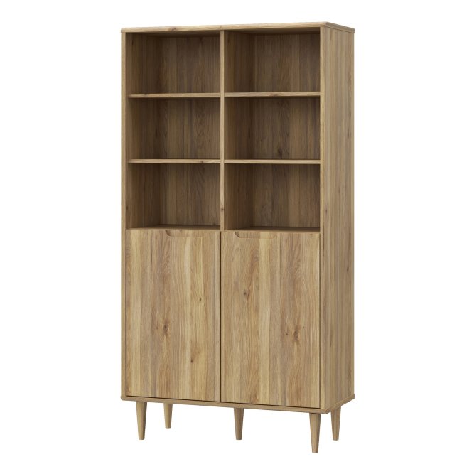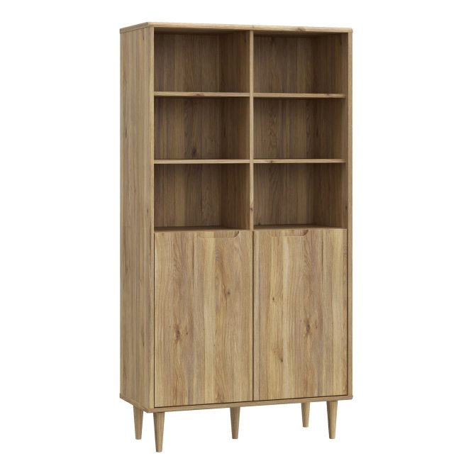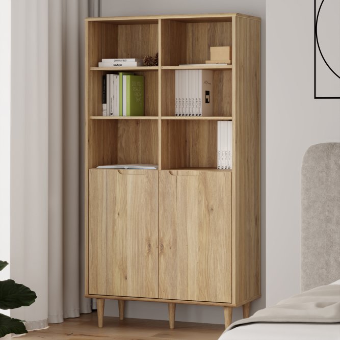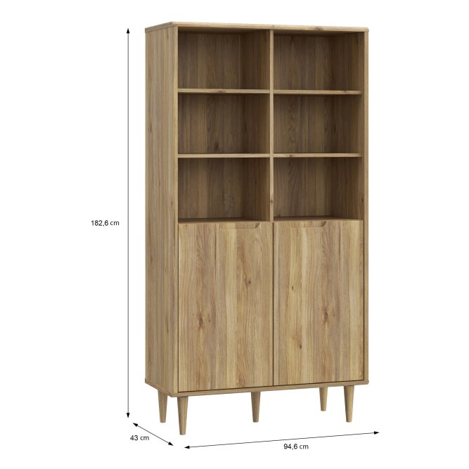 Regał wyposażony jest w 6 otwartych półek wnękowych i 2 dolne zamykane drzwiami szafki — razem 8 półek