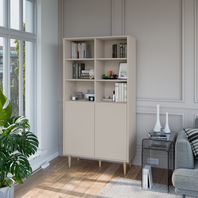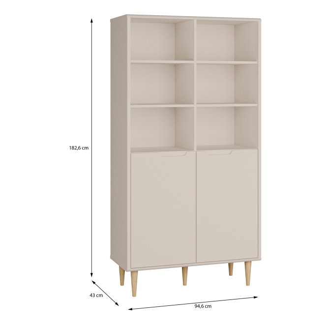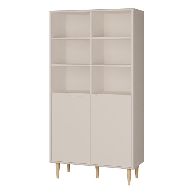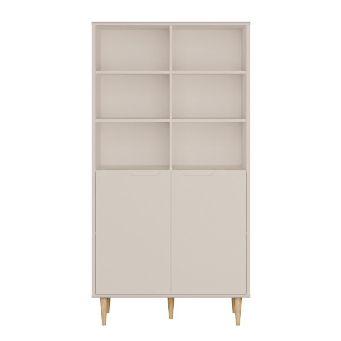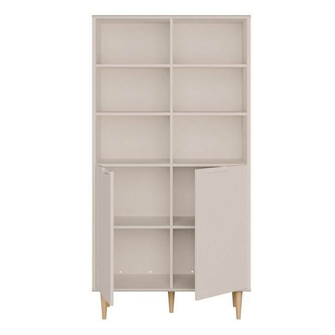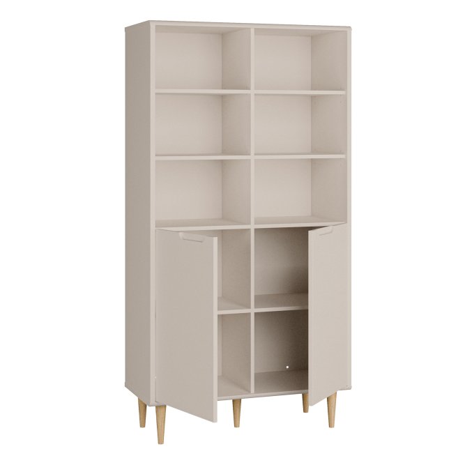 Regał wyposażony jest w 6 otwartych półek wnękowych i 2 dolne zamykane drzwiami szafki — razem 8 półek