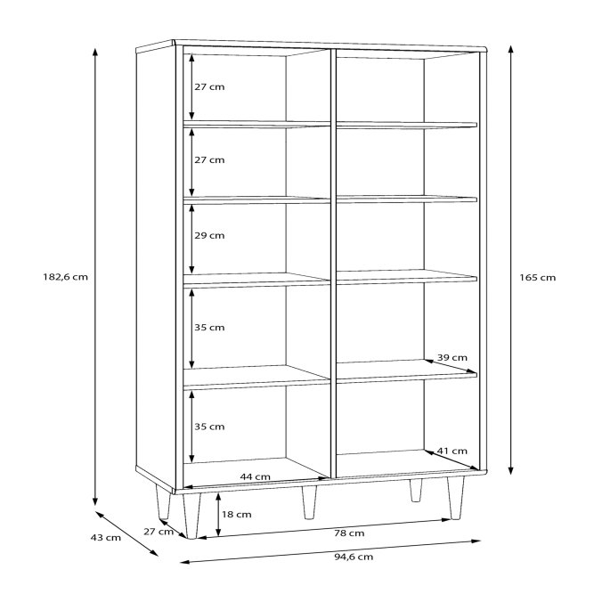 Wymiary regału: szer. 94,6 cm × wys. 182,6 cm × gł. 43 cm