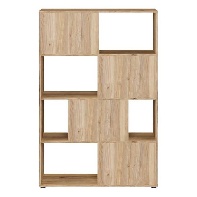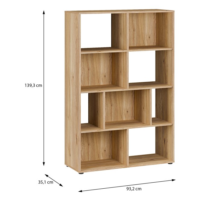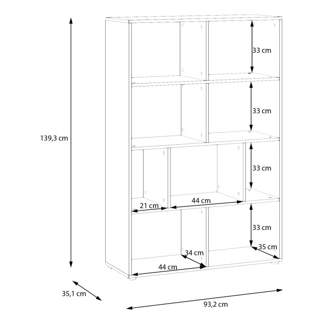 Regał o wymiarach 94,7 cm szerokości, 138,6 cm wysokości i 34,8 cm głębokości