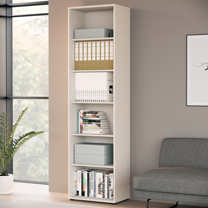 Wysoki regał o szerokości 54 cm w stylowym piaskowym kolorze świetnie sprawdzi się w domowym gabinecie, salonie czy pokoju młodzieżowym. Posiada sześć funkcjonalnych półek wnękowych, które pomieszczą książki, dokumenty i dekoracje, zachowując porządek w pomieszczeniu. Neutralny, piaskowy odcień łatwo dopasuje się do różnych aranżacji, wprowadzając ciepły, stonowany akcent. Prosta forma i schludne wykończenie gwarantują ponadczasowy wygląd, który nie przytłacza wnętrza. Regał będzie idealnym rozwiązaniem dla osób, które szukają praktycznego mebla o spokojnym, uniwersalnym charakterze.