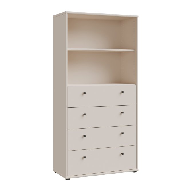 Regał z szufladami o szerokości niemal 74 cm w stylowym piaskowym kolorze świetnie sprawdzi się w domowym gabinecie, salonie czy pokoju młodzieżowym. Posiada cztery pojemne szuflady i dwie funkcjonalne półki wnękowe, które pomieszczą książki, dokumenty i dekoracje, zachowując porządek w pomieszczeniu. Neutralny, piaskowy odcień łatwo dopasuje się do różnych aranżacji, wprowadzając ciepły, stonowany akcent. Prosta forma i schludne wykończenie gwarantują ponadczasowy wygląd, który nie przytłacza wnętrza. Regał będzie idealnym rozwiązaniem dla osób, które szukają praktycznego mebla o spokojnym, uniwersalnym charakterze.