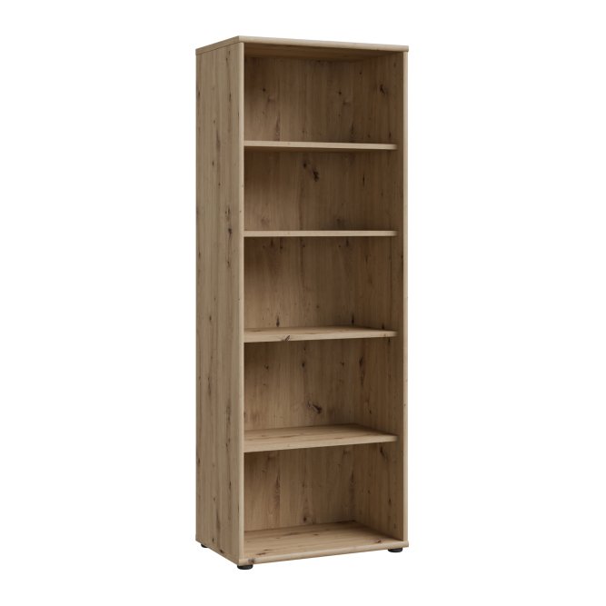 Regał o szerokości 54 cm w ciepłym, przytulnym dekorze imitującym naturalne usłojenie drewna świetnie sprawdzi się w domowym gabinecie, salonie czy pokoju młodzieżowym. Mebel wyposażony jest w pięć funkcjonalnych półek wnękowych, które pomieszczą książki, dokumenty i dekoracje, zachowując porządek w pomieszczeniu. Naturalny drewniany odcień łatwo dopasuje się do różnych aranżacji, wprowadzając stylowy akcent. Prosta forma i schludne wykończenie gwarantują ponadczasowy wygląd, który nie przytłacza wnętrza. Regał będzie idealnym rozwiązaniem dla osób, które szukają praktycznego mebla o klasycznym, uniwersalnym charakterze.