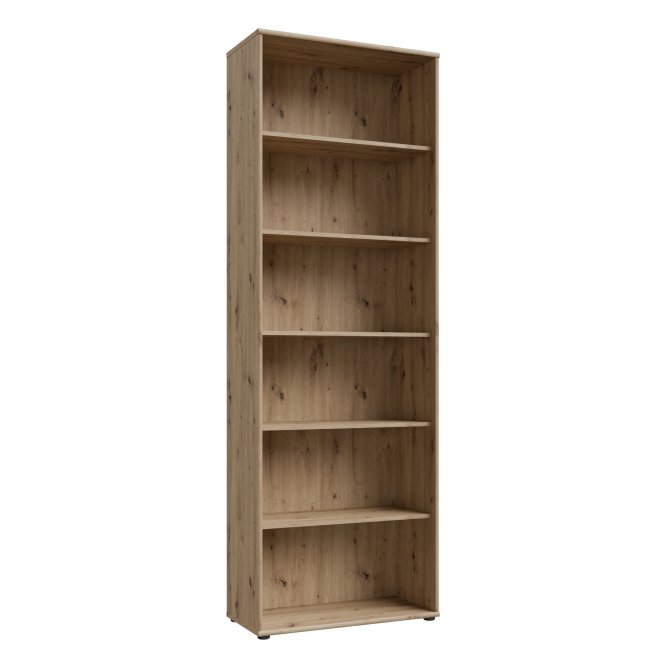 Wysoki regał o szerokości niemal 74 cm w ciepłym, przytulnym dekorze imitującym naturalne usłojenie drewna świetnie sprawdzi się w domowym gabinecie, salonie czy pokoju młodzieżowym. Posiada sześć funkcjonalnych półek wnękowych, które pomieszczą książki, dokumenty i dekoracje, zachowując porządek w pomieszczeniu. Naturalny drewniany odcień łatwo dopasuje się do różnych aranżacji, wprowadzając stylowy akcent. Prosta forma i schludne wykończenie gwarantują ponadczasowy wygląd, który nie przytłacza wnętrza. Regał będzie idealnym rozwiązaniem dla osób, które szukają praktycznego mebla o klasycznym, uniwersalnym charakterze.