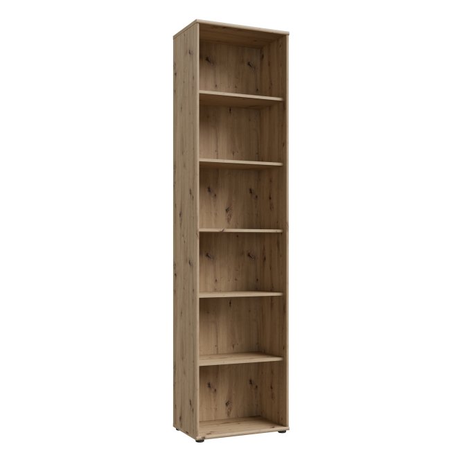 Wysoki regał o szerokości 54 cm w ciepłym, przytulnym dekorze imitującym naturalne usłojenie drewna świetnie sprawdzi się w domowym gabinecie, salonie czy pokoju młodzieżowym. Posiada sześć funkcjonalnych półek wnękowych, które pomieszczą książki, dokumenty i dekoracje, zachowując porządek w pomieszczeniu. Naturalny drewniany odcień łatwo dopasuje się do różnych aranżacji, wprowadzając stylowy akcent. Prosta forma i schludne wykończenie gwarantują ponadczasowy wygląd, który nie przytłacza wnętrza. Regał będzie idealnym rozwiązaniem dla osób, które szukają praktycznego mebla o klasycznym, uniwersalnym charakterze.