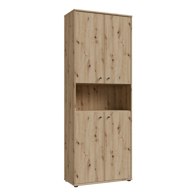 Regał z szafkami o szerokości niemal 74 cm w ciepłym, przytulnym dekorze imitującym naturalne usłojenie drewna świetnie sprawdzi się w domowym gabinecie, salonie czy pokoju młodzieżowym. Mebel wyposażony jest w dwie zamykane szafki, w których znajdują się cztery funkcjonalne półki i jedną otwartą półkę wnękową, które pomieszczą książki, dokumenty i dekoracje, zachowując porządek w pomieszczeniu. Naturalny drewniany odcień łatwo dopasuje się do różnych aranżacji, wprowadzając stylowy akcent. Prosta forma i schludne wykończenie gwarantują ponadczasowy wygląd, który nie przytłacza wnętrza. Regał będzie idealnym rozwiązaniem dla osób, które szukają praktycznego mebla o klasycznym, uniwersalnym charakterze.