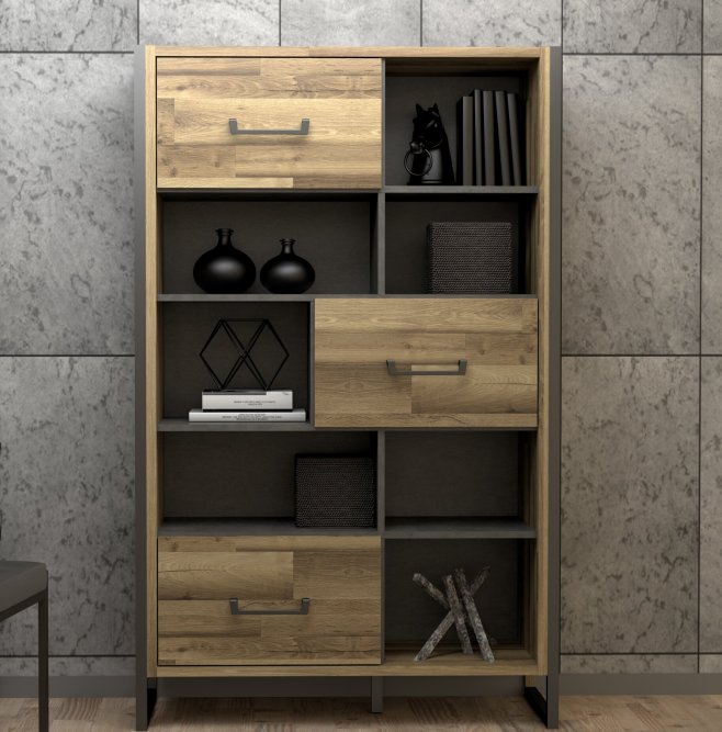 Nowoczesny regał to fantastyczny mebel do biura, salonu lub pokoju młodzieżowego. Mebel został wykonany w dekorze Dąb Klepkowy, który doskonale odwzorowuje naturalne drewno i nada pomieszczeniu przytulnego i eleganckiego klimatu. Bryłę mebla okalają ramowe nogi i wstawki w kolorze Betonu Ciemnoszarego.