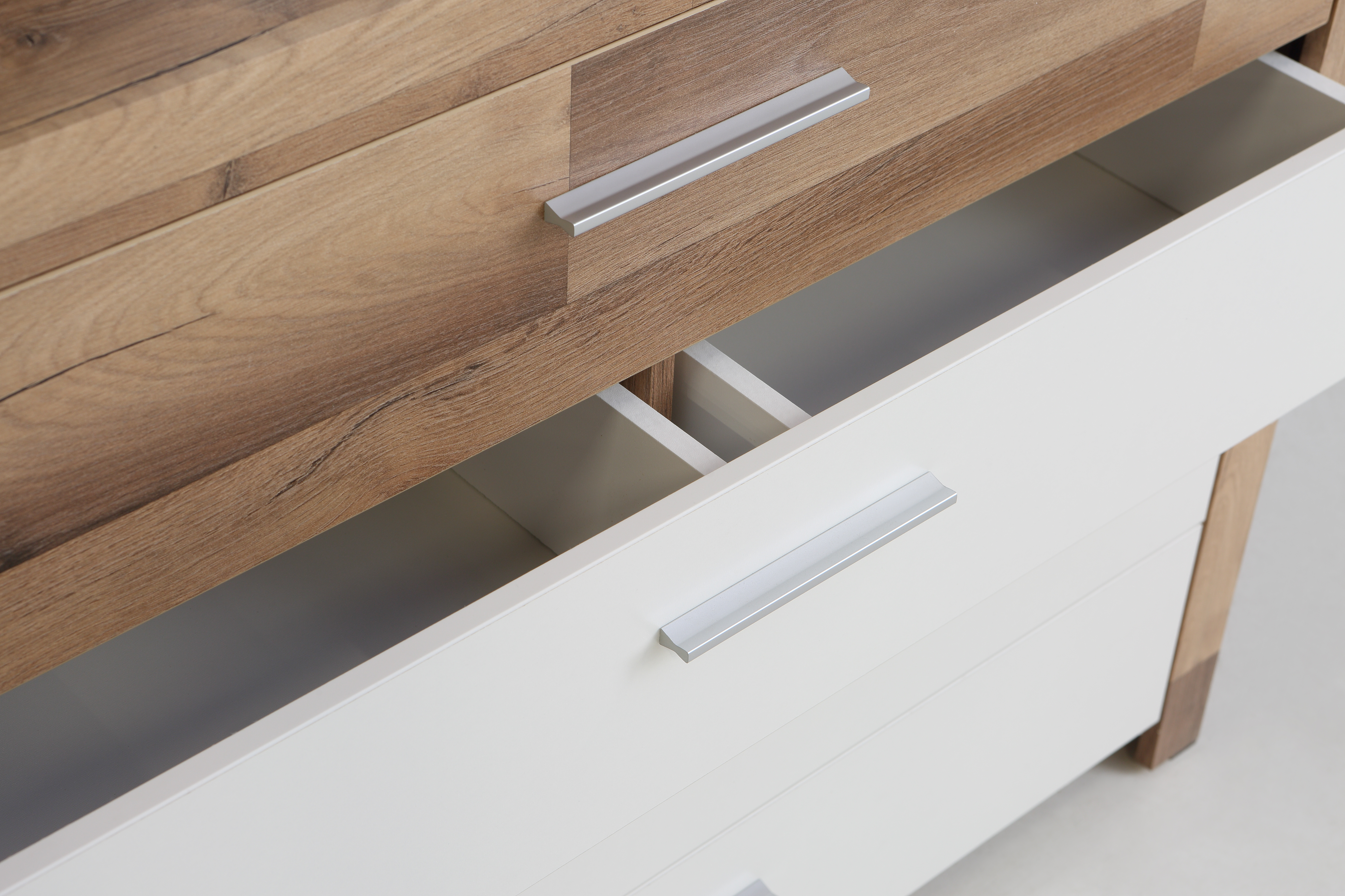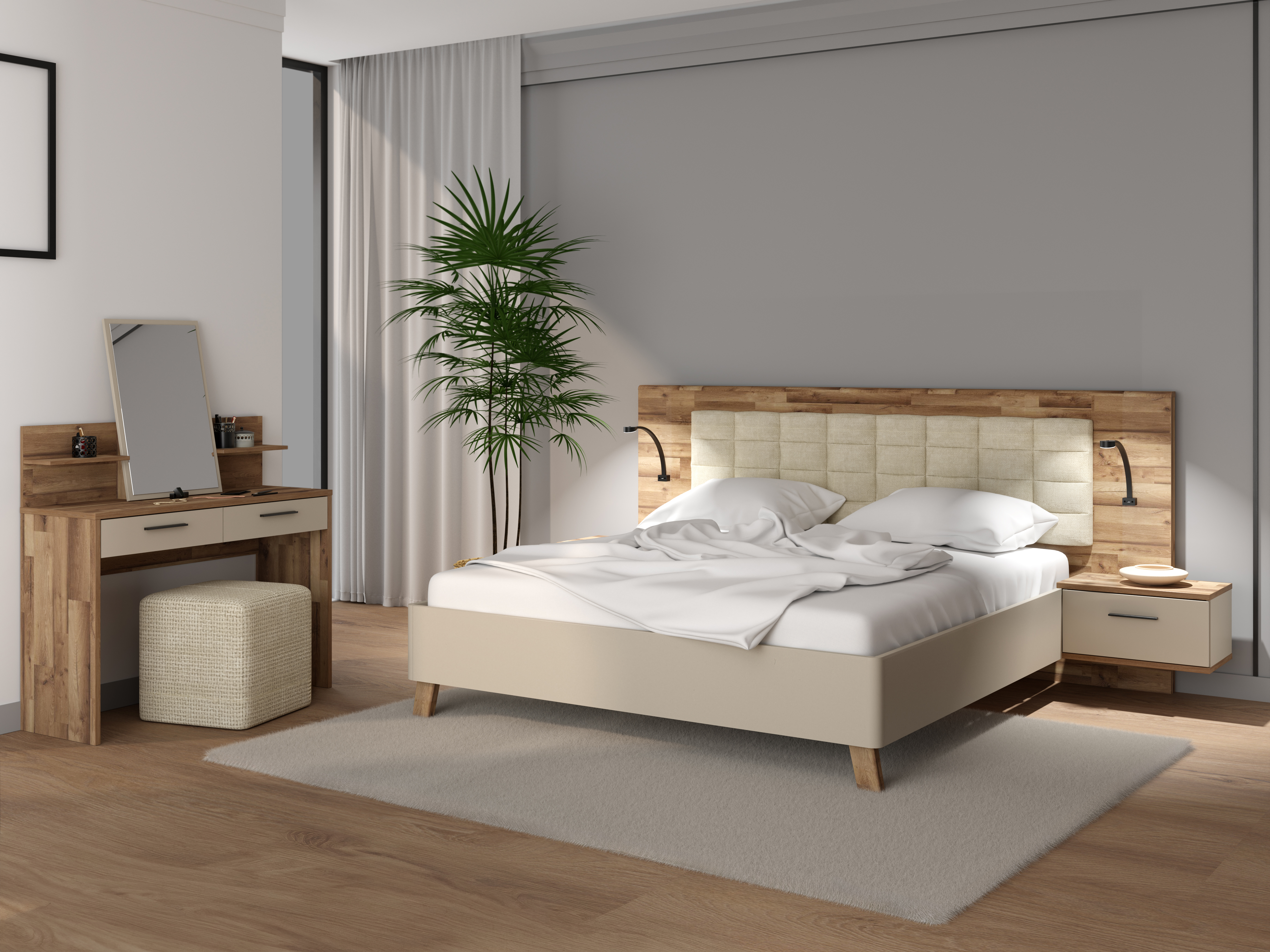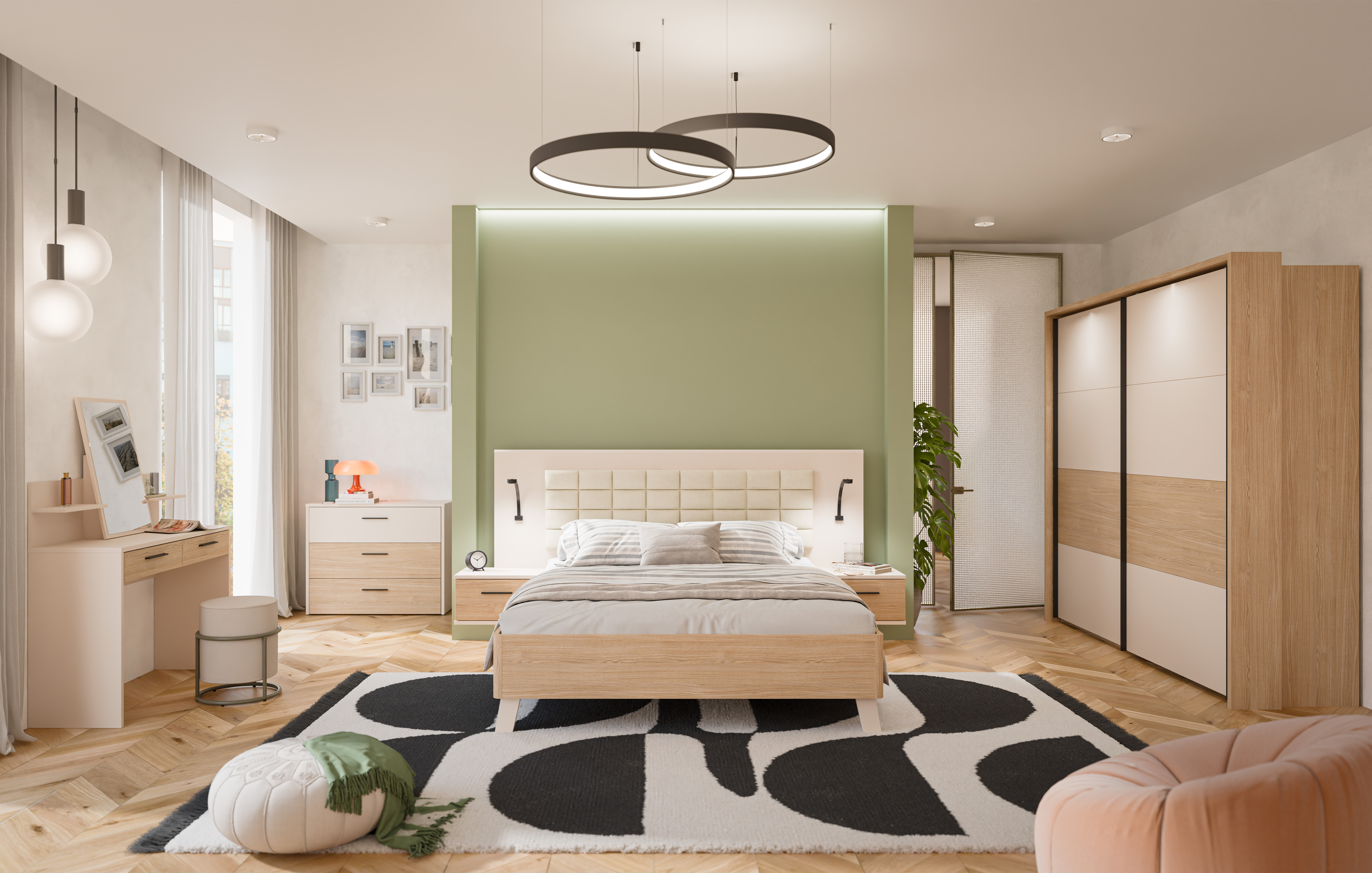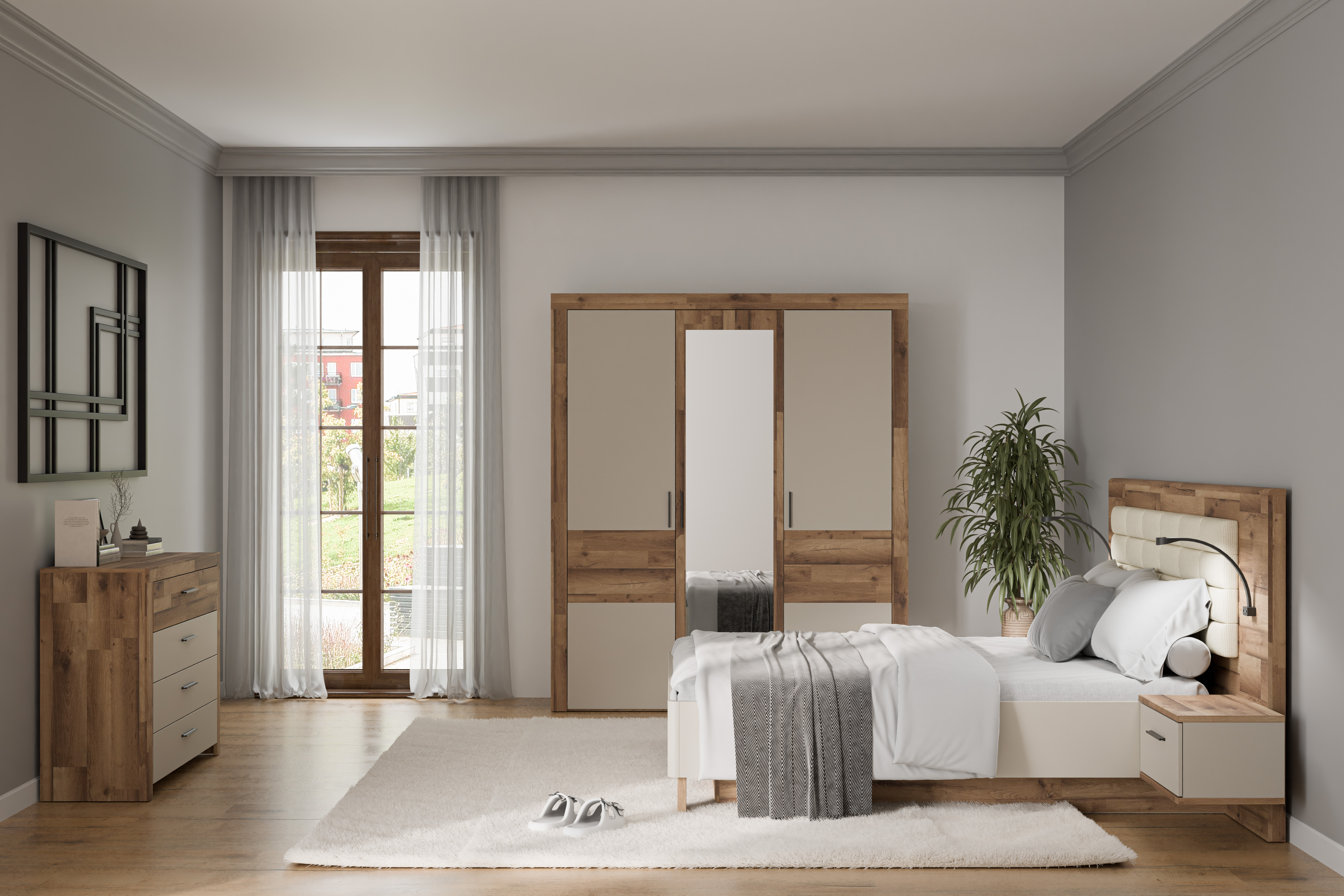Subtelne odcienie dębu nadają szlachetności każdemu wnętrzu. Są idealną bazą kompozycyjną, tworząc zgrane duety z tajemniczymi i ponadczasowymi szarościami lub niekazitelną bielą. Obok takiego zestawienia trudno przejść obojętnie. Podobnie jak obok sypialni RICCIANO. Uwagę w kolekcji przyciąga zagłówek. Tapicerowana płaszczyzna zamknięta w dębowe ramy i uzupełniona oświetleniem przyciąga spojrzenie i podkreśla charakter całego wnętrza. Dodatkowo stelaż łóżka wzbogacony jest o komplet stylowych szafek nocnych. Elegancka i pojemna zarazem szafa ubraniowa ( w 2 szerokościach do wyboru ) w asyście listew oświetleniowych, nie tylko nada powagi, ale i wyróżni całe pomieszczenie. Uzupełnieniem kolekcji jest komoda - przestronna i gustowna. Sypialnia RICCIANO jest uszyta na miarę każdej artystycznej duszy.