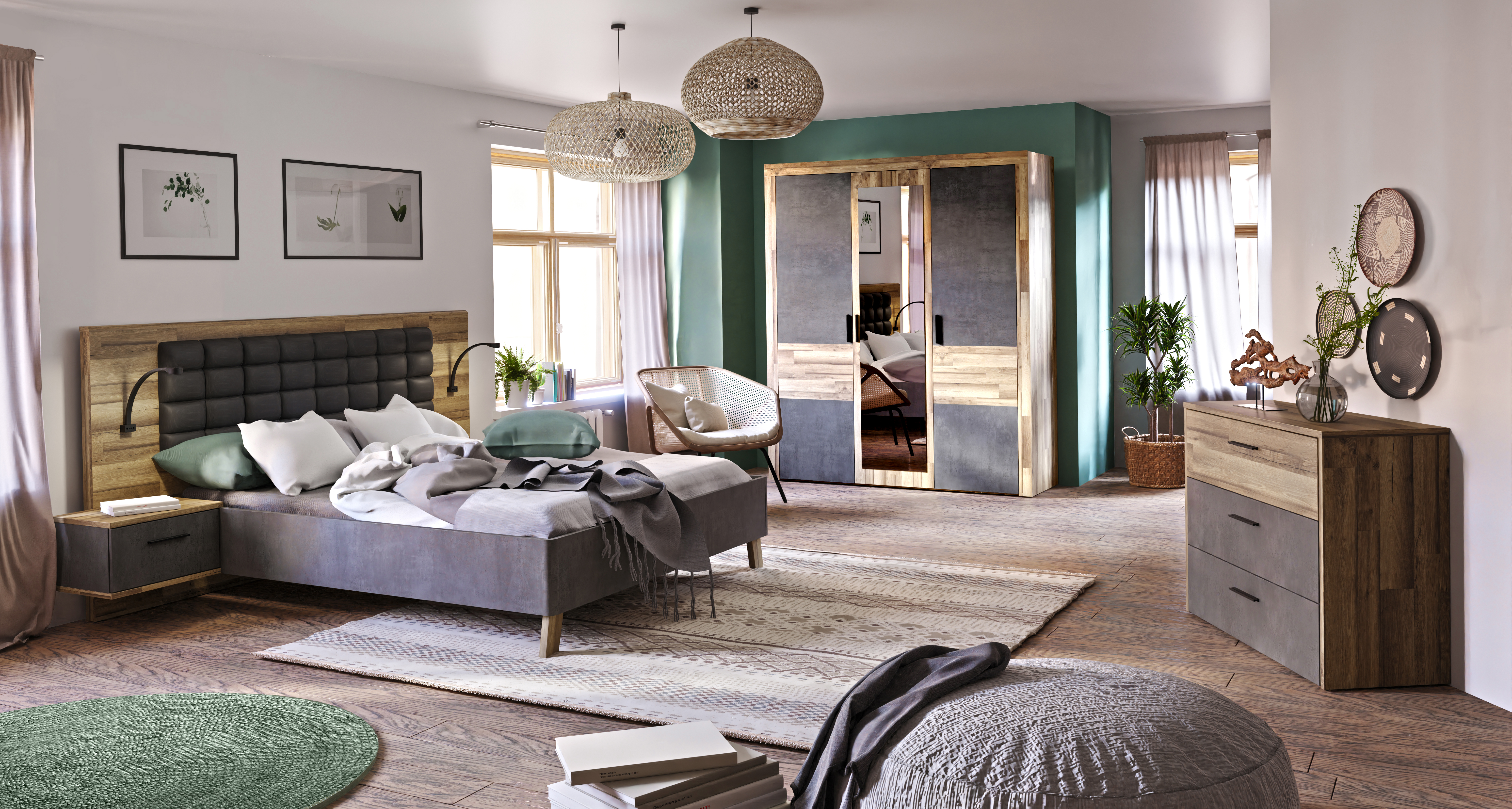 Subtelne odcienie dębu nadają szlachetności każdemu wnętrzu. Są idealną bazą kompozycyjną, tworząc zgrane duety z tajemniczymi i ponadczasowymi szarościami lub niekazitelną bielą. Obok takiego zestawienia trudno przejść obojętnie. Podobnie jak obok sypialni RICCIANO. Uwagę w kolekcji przyciąga zagłówek. Tapicerowana płaszczyzna zamknięta w dębowe ramy i uzupełniona oświetleniem przyciąga spojrzenie i podkreśla charakter całego wnętrza. Dodatkowo stelaż łóżka wzbogacony jest o komplet stylowych szafek nocnych. Elegancka i pojemna zarazem szafa ubraniowa ( w 2 szerokościach do wyboru ) w asyście listew oświetleniowych, nie tylko nada powagi, ale i wyróżni całe pomieszczenie. Uzupełnieniem kolekcji jest komoda - przestronna i gustowna. Sypialnia RICCIANO jest uszyta na miarę każdej artystycznej duszy.