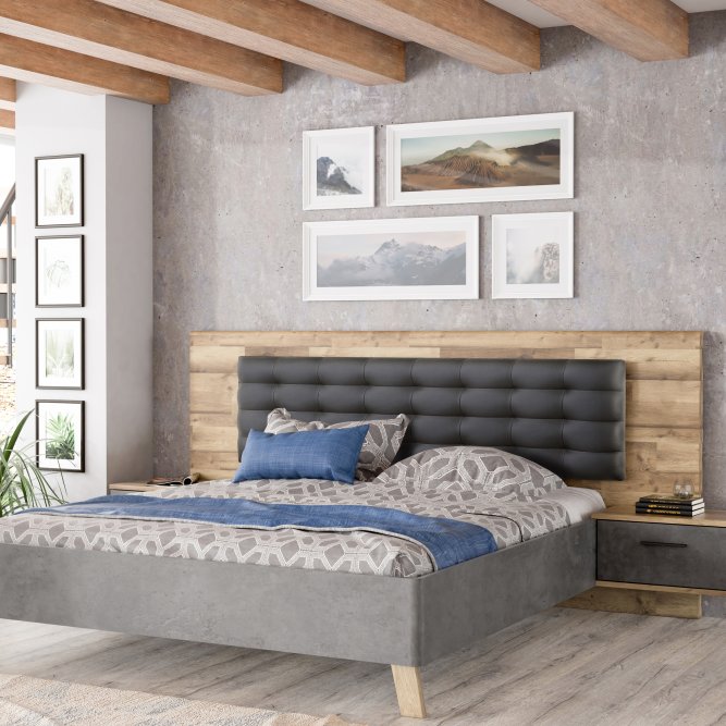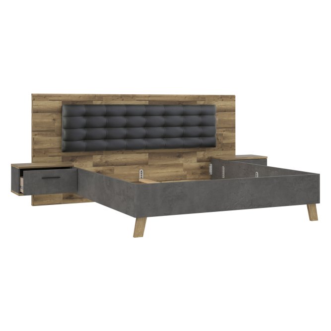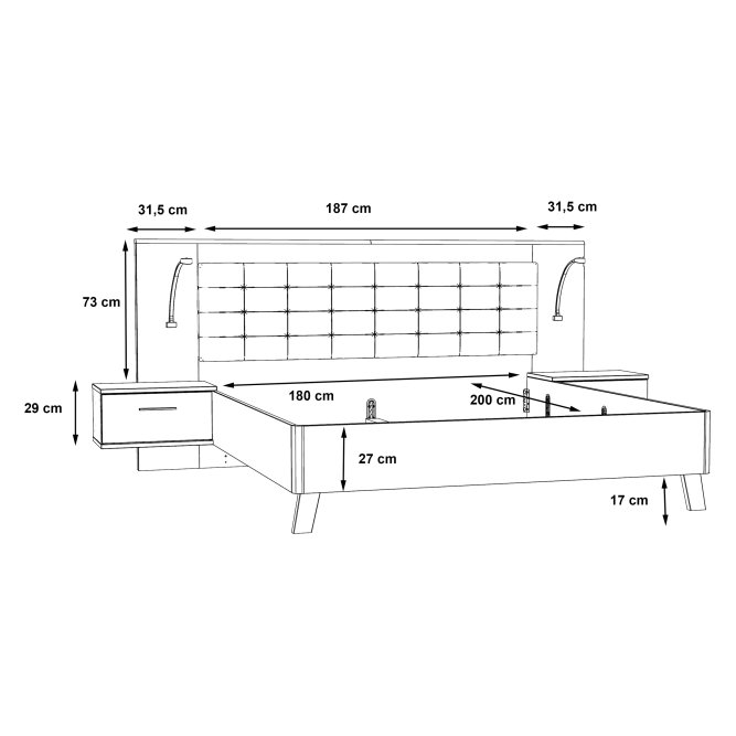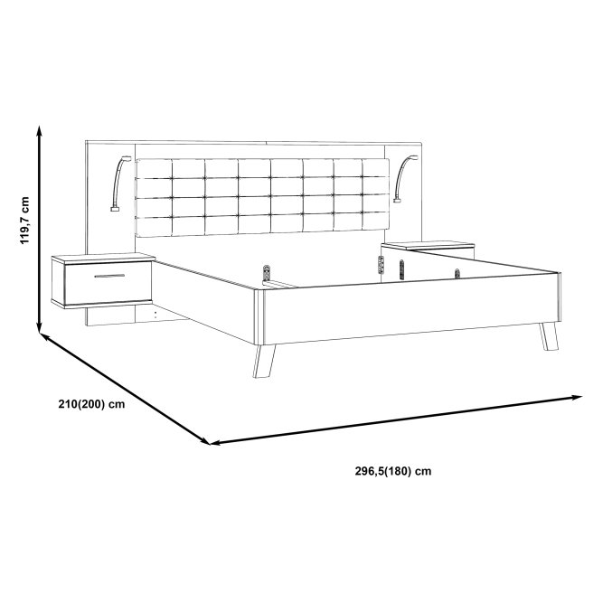 Stelaż łóżka połączony z dwoma podwieszanymi szafkami nocnymi będzie niezwykle praktycznym elementem wyposażenia sypialni. Zestaw nie tylko zagwarantuje spokojny sen i wieczorny wypoczynek, ale także umożliwi komfortowe przechowywanie rzeczy osobistych i podręcznych drobiazgów. Szczególną wygodę zapewnia tapicerowany zagłówek stanowiący komfortowe oparcie podczas relaksu z książką czy laptopem.