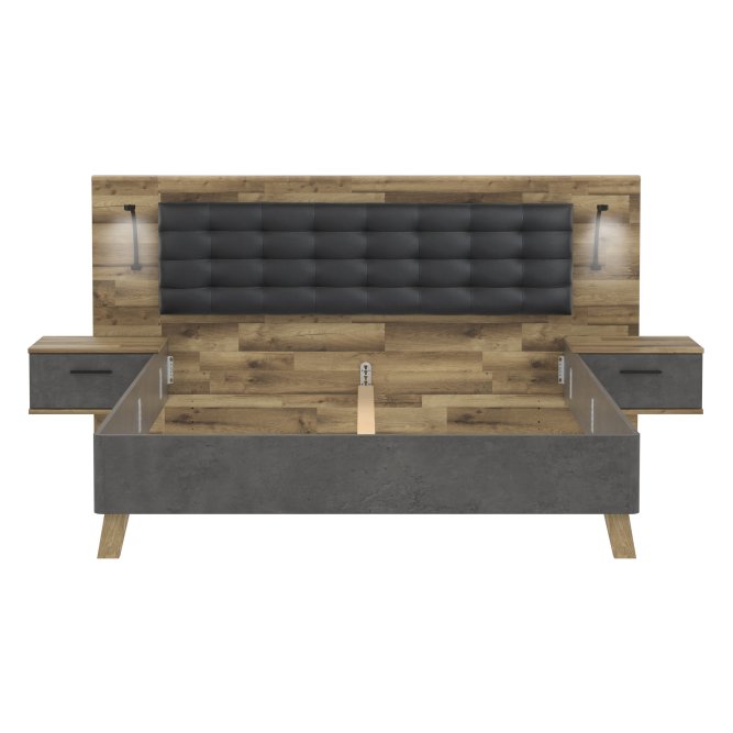 Stelaż łóżka połączony z dwoma podwieszanymi szafkami nocnymi będzie niezwykle praktycznym elementem wyposażenia sypialni. Zestaw nie tylko zagwarantuje spokojny sen i wieczorny wypoczynek, ale także umożliwi komfortowe przechowywanie rzeczy osobistych i podręcznych drobiazgów. Szczególną wygodę zapewnia tapicerowany zagłówek stanowiący komfortowe oparcie podczas relaksu z książką czy laptopem.