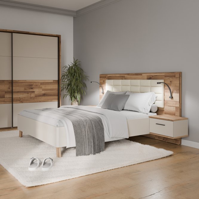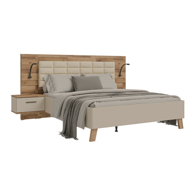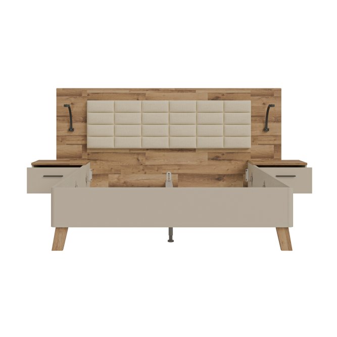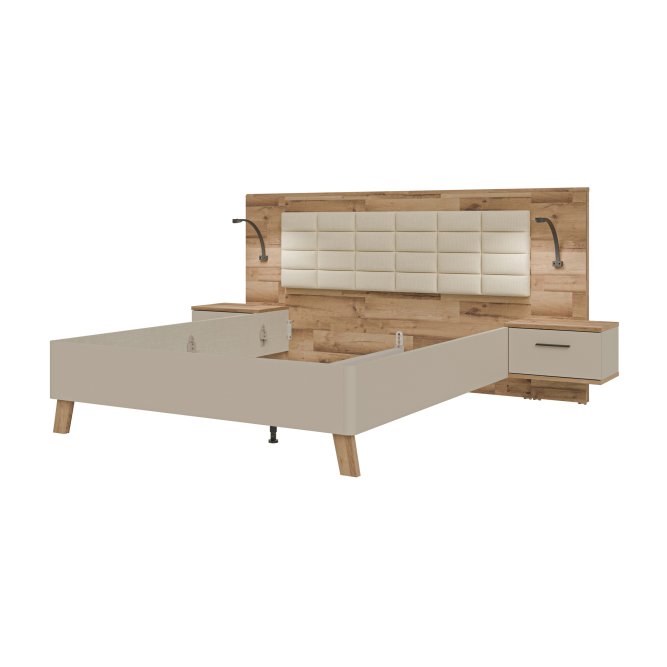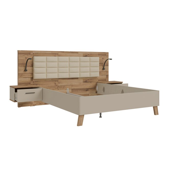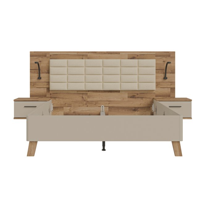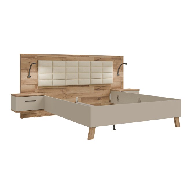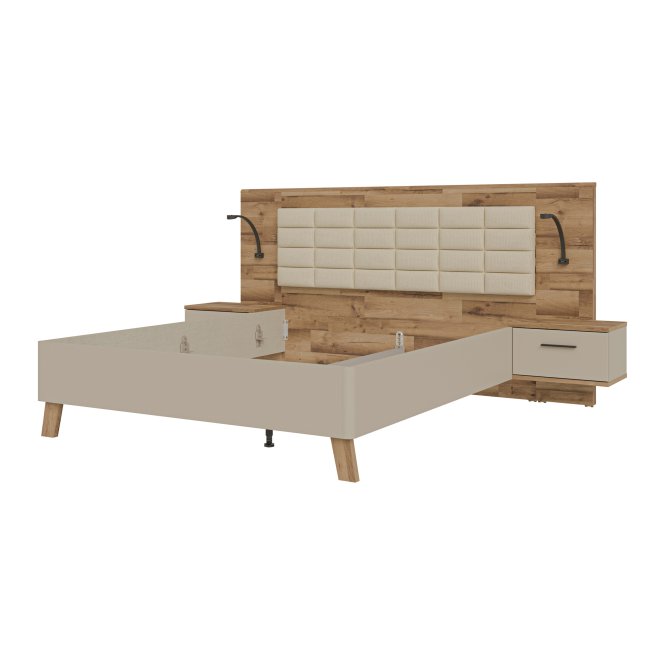 Łóżko z szafkami nocnymi RICCIANO doskonale wkomponuje się w aranżację sypialni w stylu n/a. Powierzchnia spania o wymiarach 200x160 cm tworzy komfortowe miejsce na wieczorny relaks oraz spokojny sen. (2) szuflady zapewniają dodatkową przestrzeń do przechowywania.Mebel w dekorze Piaskowy ) / Dąb klepkowy )/ Piaskowy ) / Dąb klepkowy ) możesz zestawić z innymi elementami kolekcji.