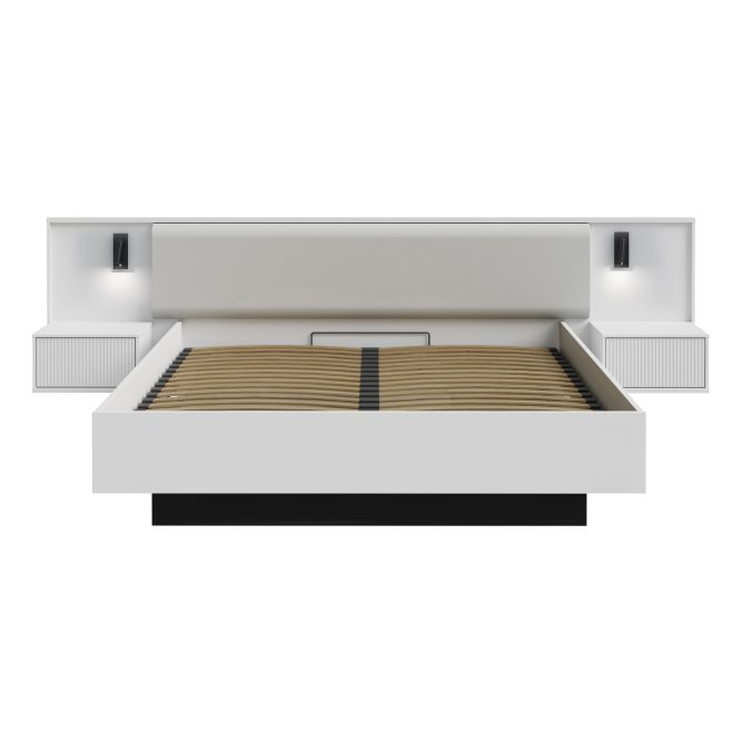 Łóżko z pojemnikiem i szafkami nocnymi NEKTARIUS będzie funkcjonalnym i wyróżniającym się elementem wystroju Twojego mieszkania. Zintegrowane szafki możesz wykorzystać do przechowywania drobiazgów. Połącz z innymi meblami z kolekcji, aby stworzyć spójną aranżację wnętrza.