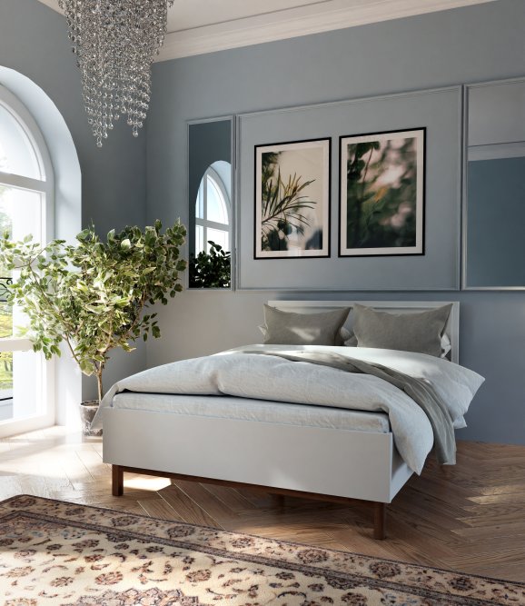 - Stylowym akcentem jest cienka ramka na zagłówku łóżka, przypominające sztukaterię
