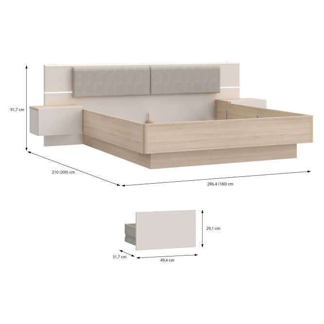 - Stelaż łóżka o wymiarach 286,4 cm szerokości, 91,7 cm wysokości wezgłowia oraz 200 cm głębokości