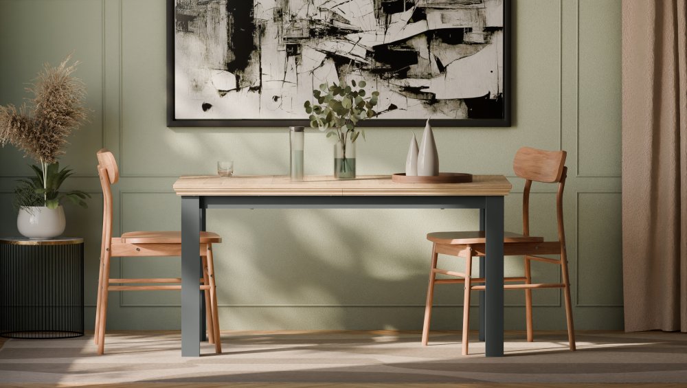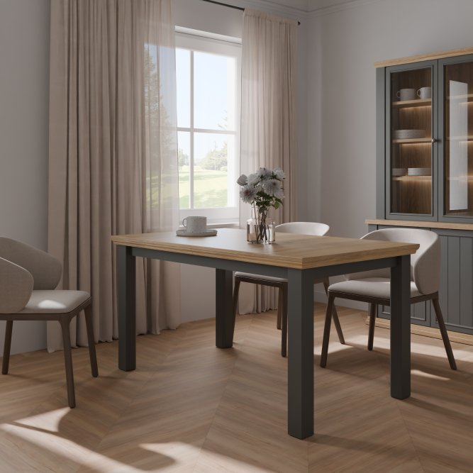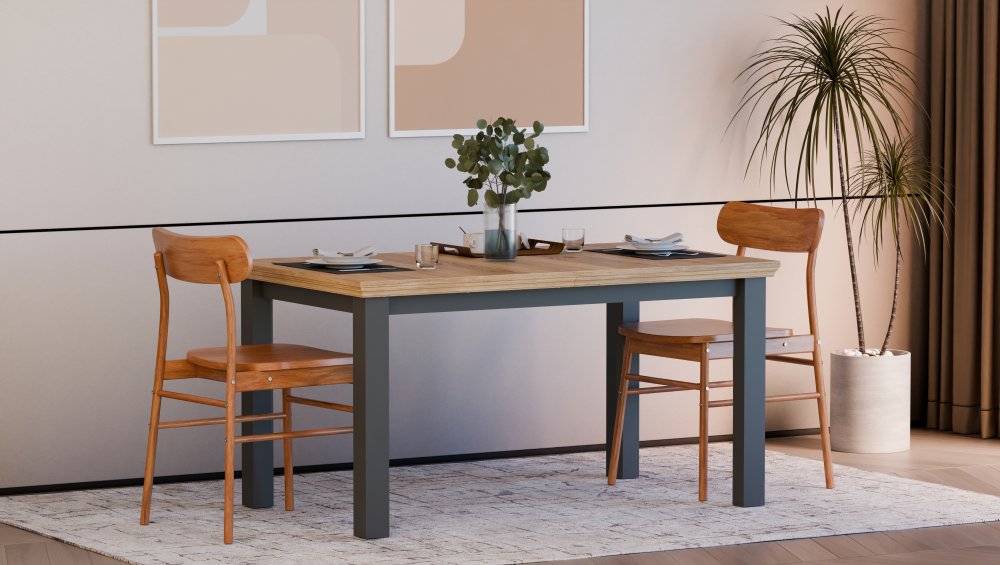 Stół wykonany w efektownym połączeniu dekorów: Dąb Mauvella / Uni Wolfram Szary