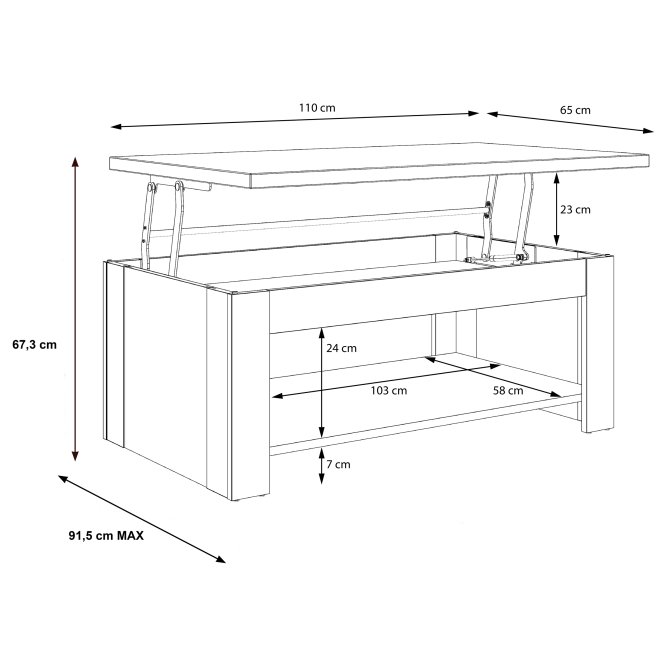 - Możliwe podwyższenie i wysunięcie blatu, natomiast pod blatem, znajdziemy otwartą wnękę na przedmioty które chcemy mieć pod ręką, na przykład piloty lub gazety i magazyny