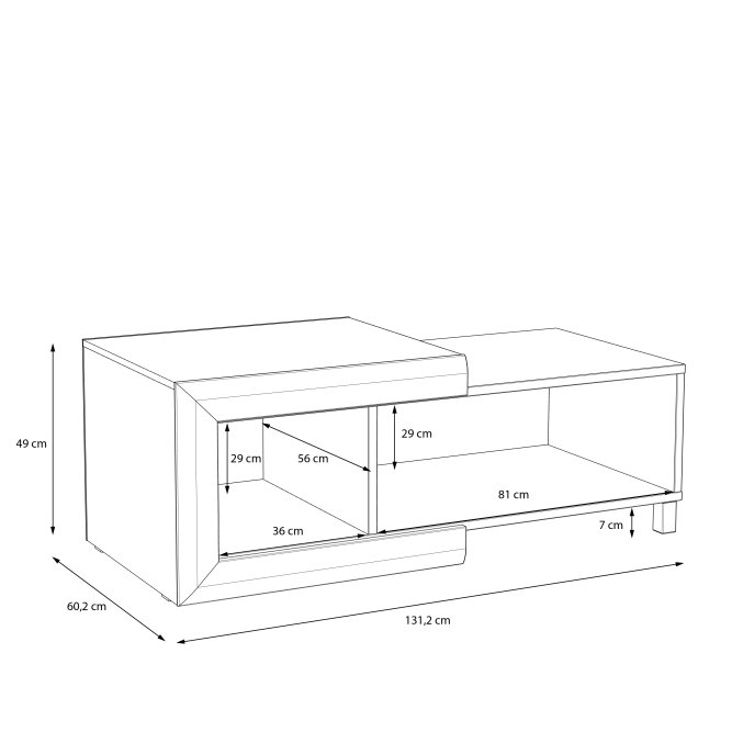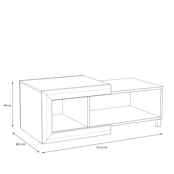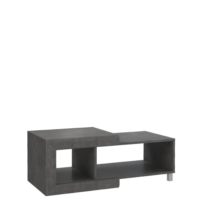 Cechą charakterystyczną stolika jest jego asymetryczny kształt oraz połączenie modnego wybarwienia Ciemnoszarego Betonu z aluminiowymi nóżkami. Przestrzeń pod dwupoziomowym blatem, wyposażona w półkę i praktyczną przegrodę, pozwoli odpowiednio zorganizować miejsce do przechowywania najpotrzebniejszych rzeczy.